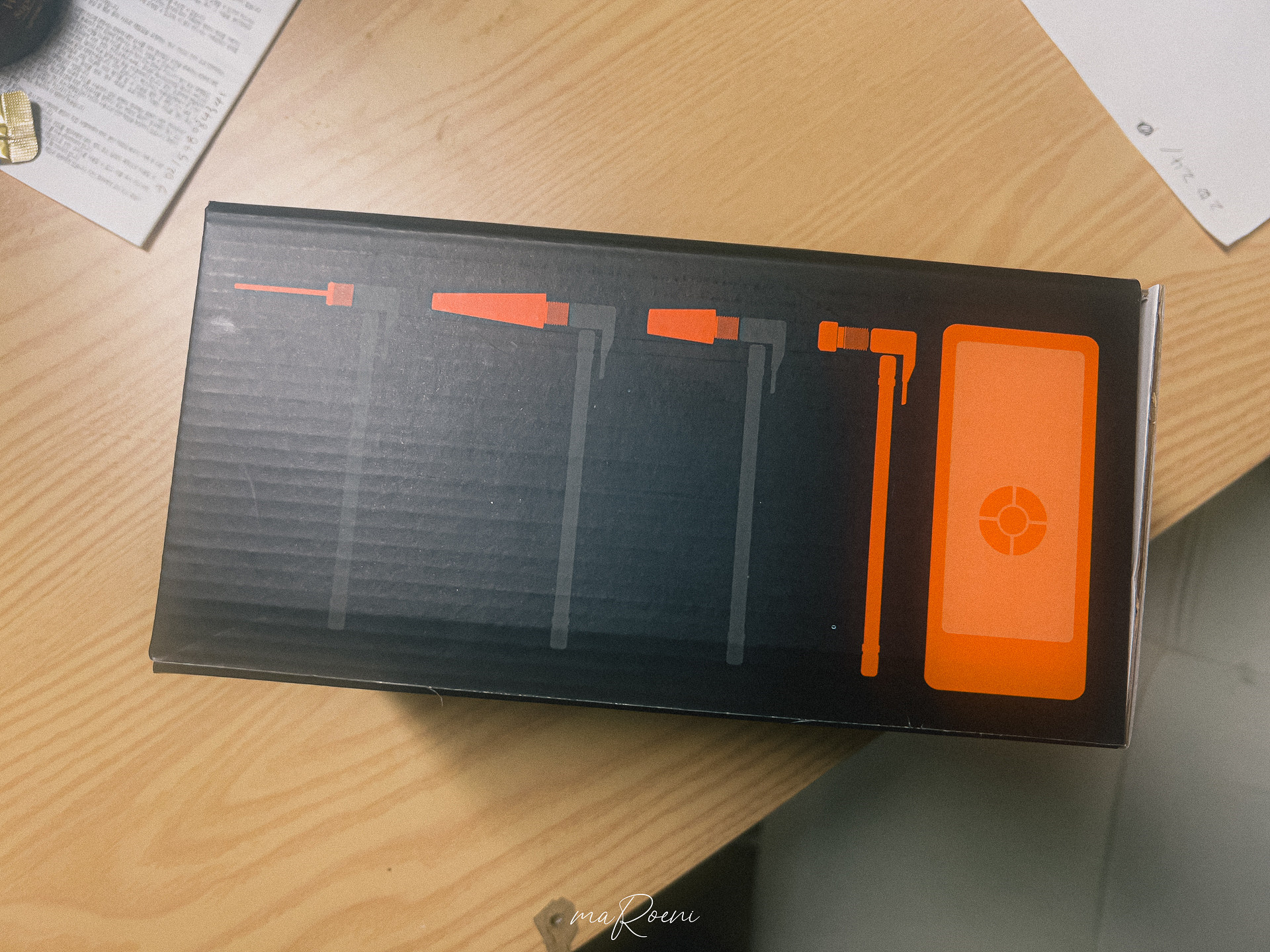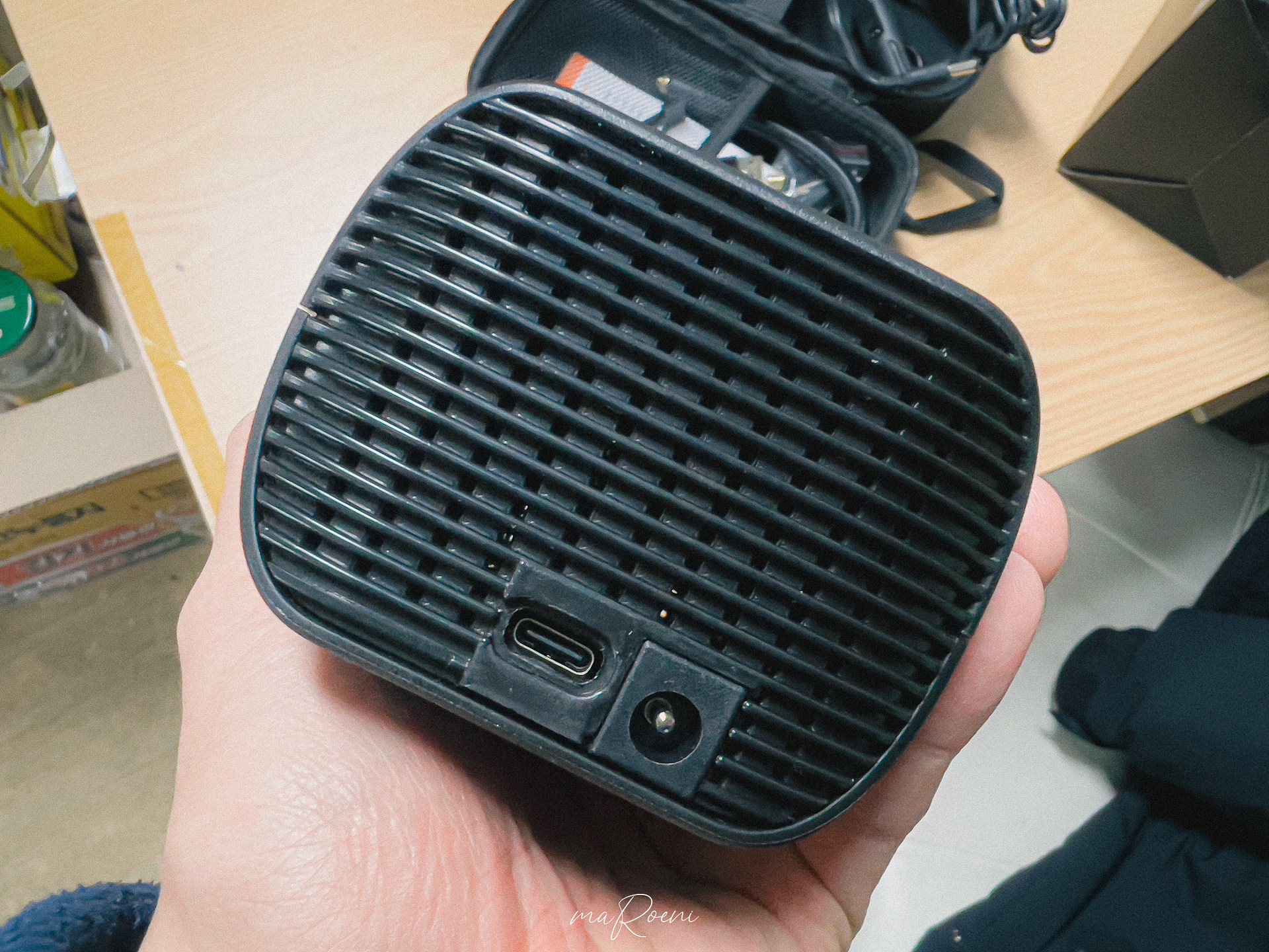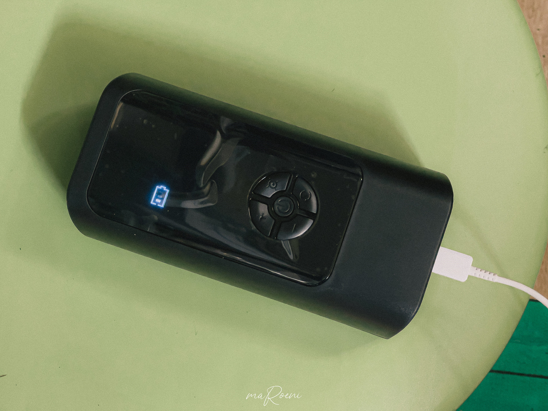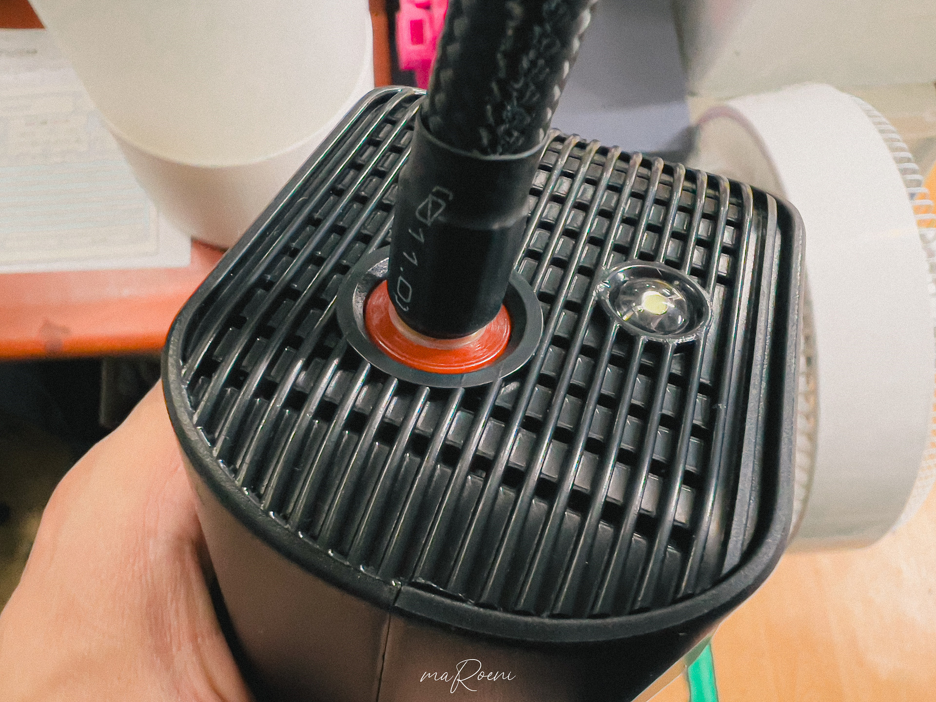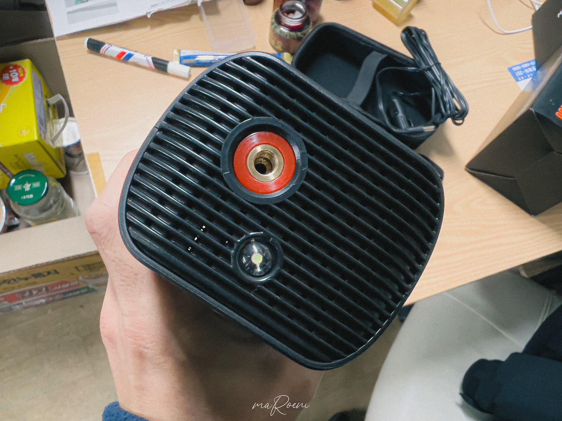 하단에는 시거잭이나 USB-C 타입으로 충전할 수 있는 포트가 있고 상단에는 노즐을 연결하는 빨간색 부분과 어두울때 공기 주입하기 편하라고 손전등 용도로 달아놓은 플래쉬가 있다.