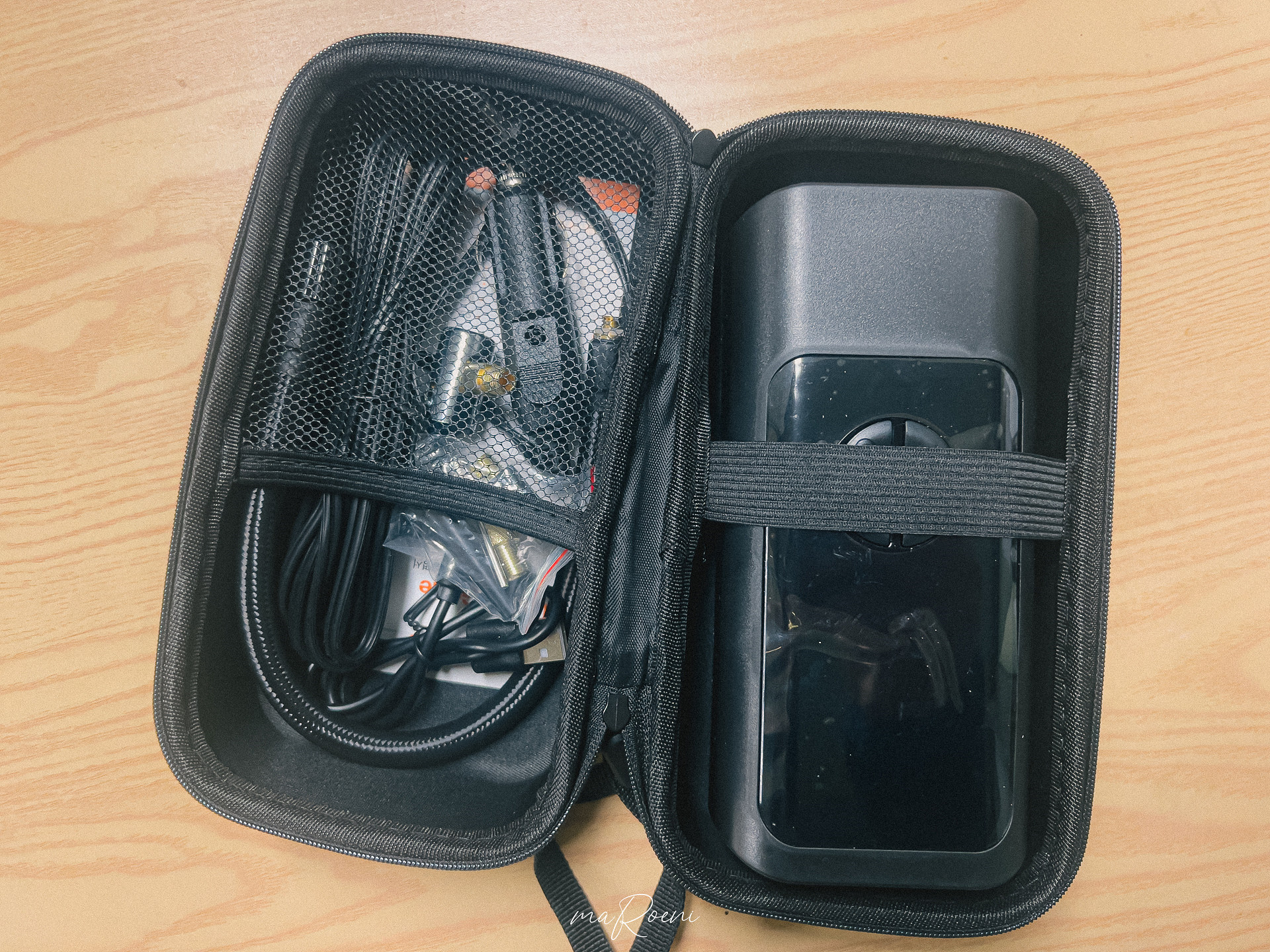 파우치를 열면 메이튼 타이어 공기압 주입기 본체와 함께 타이어에 연결하는 각종 부품들이 들어있다.
