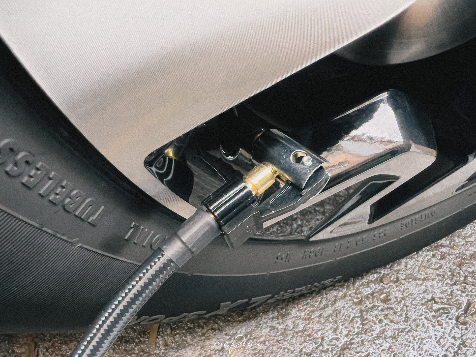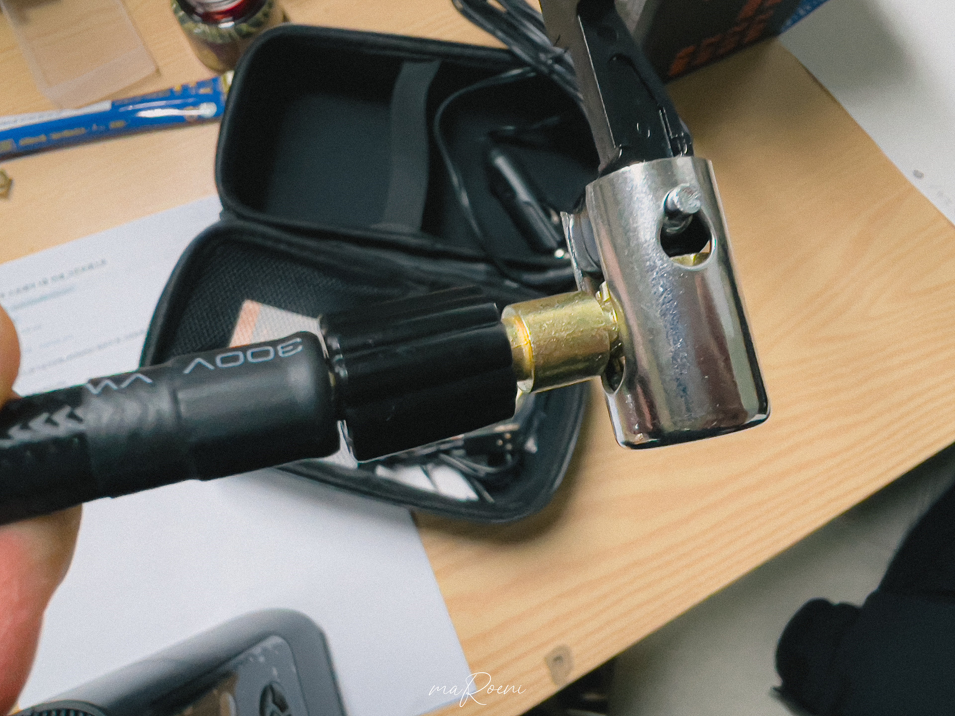 고무 마개를 제거한 후 메이튼 공기압 주입기를 연결해 주고 원터치 걸쇠를 걸어준다. 걸쇠를 걸때 쉬이이이~ 하면서 공기가 살짝 빠지는데 신경쓰지 않아도 된다. 참고로 공기압을 주입할 때 저 부분의 온도가 살짝 올라가서 뜨끈뜨끈 해지니 맨손으로 작업하는 것보다는 장갑을 이용해서 작업하는 것을 권장한다.