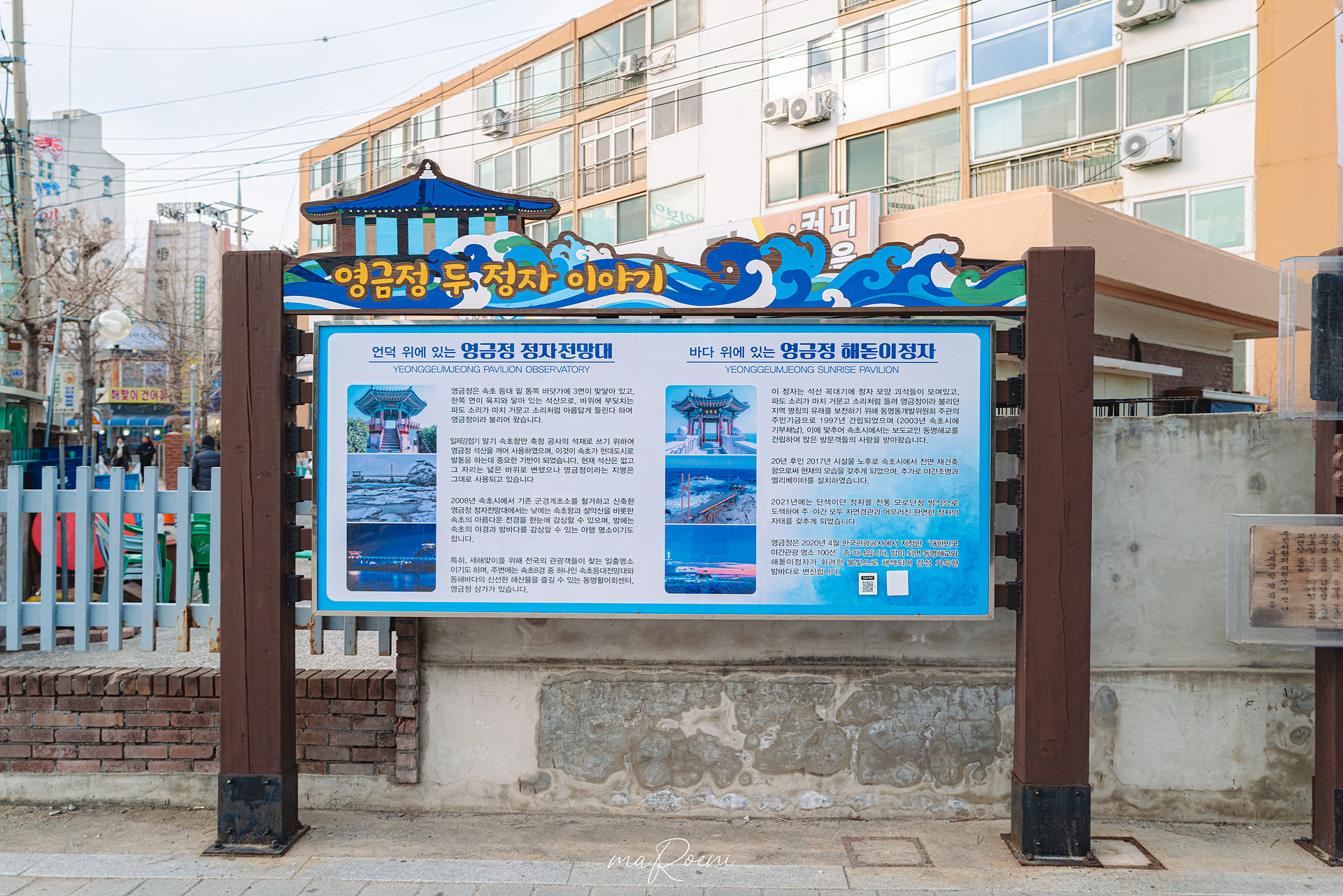 영금정은 풍경을 좋아하는 사람들에게는 매력적인 장소이지만 액티비티한 스팟을 좋아하는 세대들에게는 유사 소래포구 그 이상도 그 이하도 아닐지 모르겠다. 날씨라도 좋다면 모를까.. 흐리멍텅한 날에 이곳을 찾아온다면 다소 지루함을 느낄지도 모르니 날씨를 잘 알아보고 찾아오는 것을 추천하고 싶다.