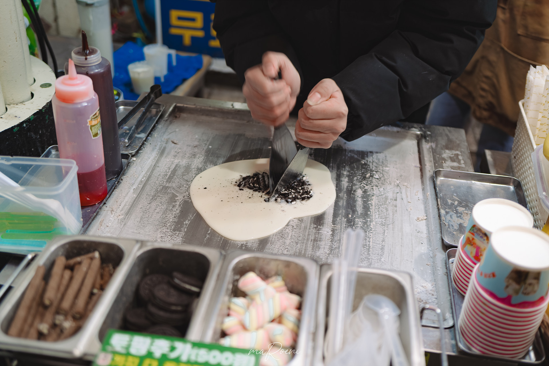 시장이라 그런지 먹거리 하나만큼은 끝내줬다. 속초가 아바이마을이 유명해서 그런지, 이곳저곳에서 오징어순대를 판매하고 있었고 이제는 인기가 조금 시들해져버린 탕후루와 철판아이스크림까지! 아이들이 좋아할만한 간식들이 정말 많아보였다. 아이는 없지만.. 괜스레 다른 아이들의 부모님 지갑은 안녕하신지 궁금해지기도 했다.