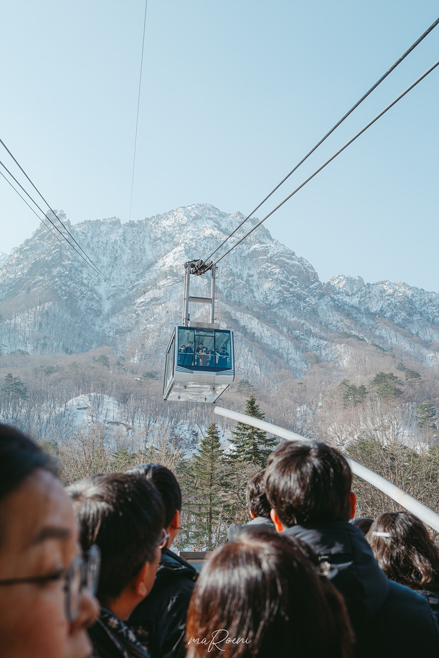 한 10분 정도 기다리니깐 설악산 케이블카 우리 차례가 다가왔음. 조금 웃긴건 티켓을 직원한테 보여주기 전까지는 줄을 서지만, 정작 케이블카 대기줄 앞에서는 아무렇게나 막 서있어도 된다는거 ㅋㅋ 저 높은 곳에서 단숨에 슝~하고 내려오는데 어찌나 아찔해보이던지!