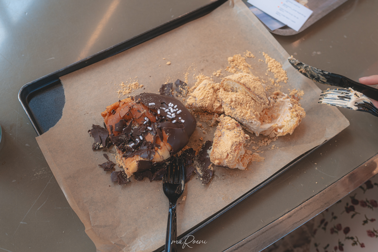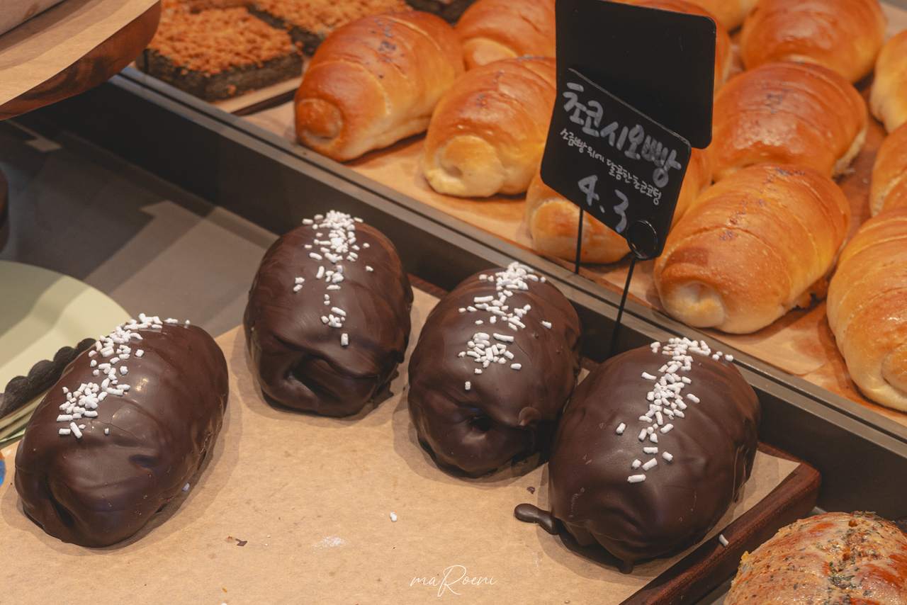 가격대는 역시나 무난쓰. 우리는 당이 떨어져서 초코시오빵(초코소금빵)이랑 인절미 가루가 발려있는 초코 단팥 크림빵인가? 하는 빵을 골랐다. 음료 2잔이랑 빵 2개 고르니깐 2만 얼마 나왔다. 허허 이 돈이면 국밥이..