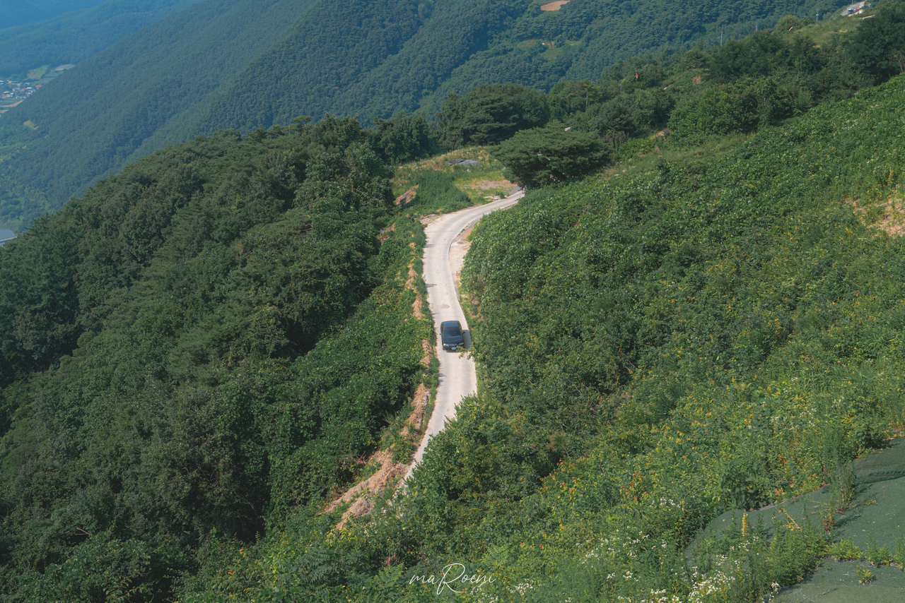 주말이라 그런지 경기도 부천에서 3시간 정도 걸렸던 모양이다. 단양 카페산은 패러글라이딩의 성지라고 불리는 단양 패러마을에 있기에 차로 굽이굽이 능선길을 따라 정상까지 올라와야만 한다. 비포장도로일 줄 알았는데, 단양 카페산 입구까지 도로가 잘 깔려있어서 아주 쌩쌩 잘 올라왔다.