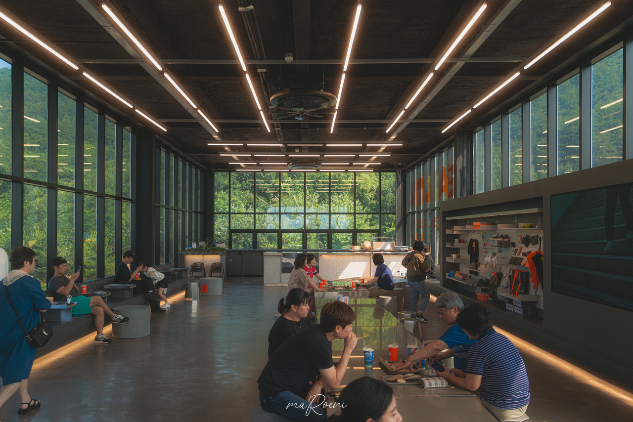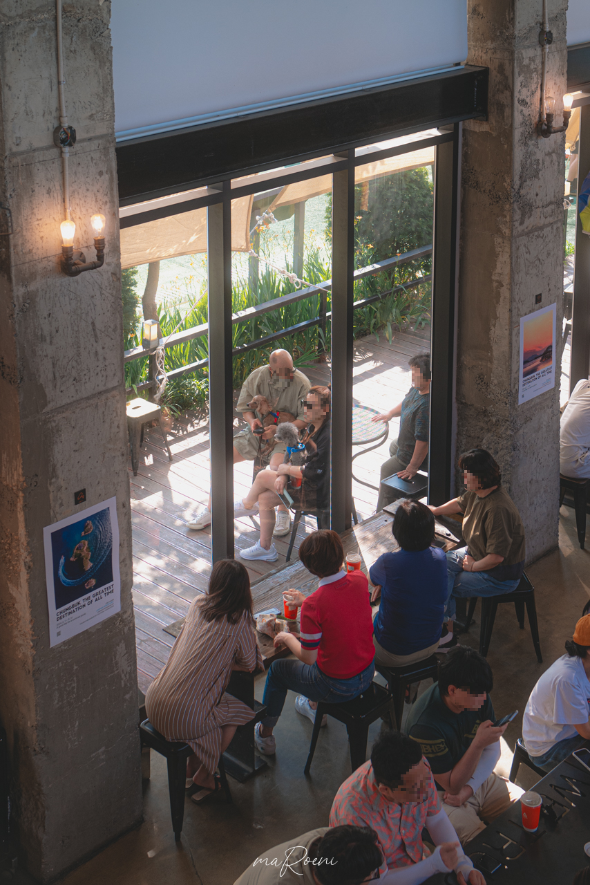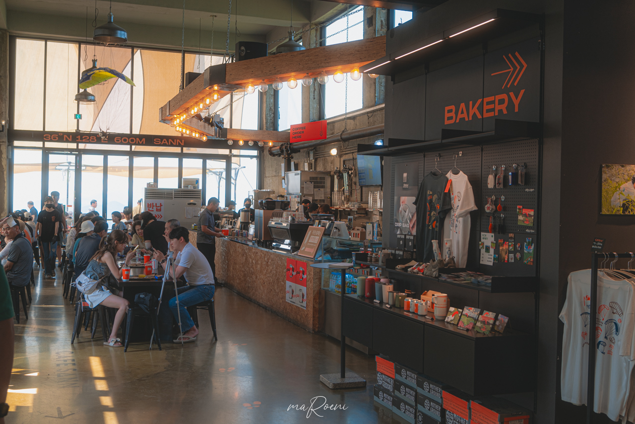 산 정상에 이런 카페가 있다니 정말 놀라울 따름이다. 왼쪽 건물은 음료를 주문하는 공간과 테라스를 이용할 수 있는 공간이고 오른쪽 건물은 빵을 주문하는 공간과 2층으로 이어지는 공간이 나온다. 따로 노는 건물 같지만 지그재그로 이어지는 공간이다.
