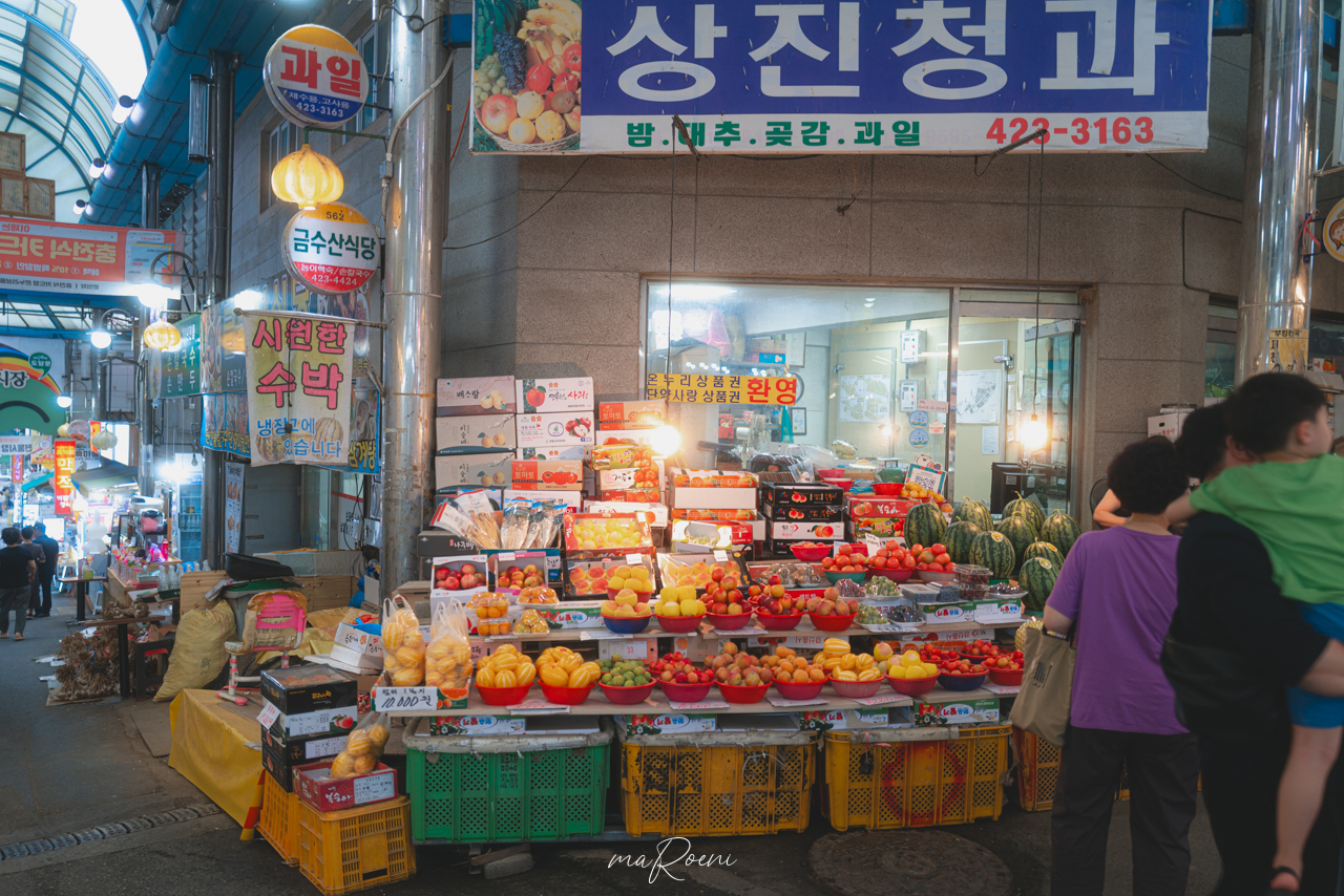 아쉬운 마음에 시장 이곳저곳이라도 둘러보기로 했다. 아주 당연하게도 횟감을 판매하기도 하고 과일을 판매하기도 한다. 어메이징 구경시장! 정말 놀라워!