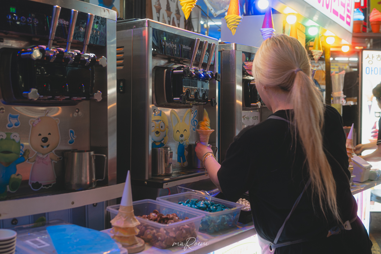 국밥을 먹고 나오니 해가 벌써 저물었다.. 이대로 돌아가긴 아까워서 예쁜 누나가 내려주는 상큼한 레몬맛 소프트아이스크림도 하나 플렉스 했다. 레인보우샤베트맛이 났는데 내 입맛에는 맞았지만 여자친구는 별로인가.. 한입 먹고 말더라.