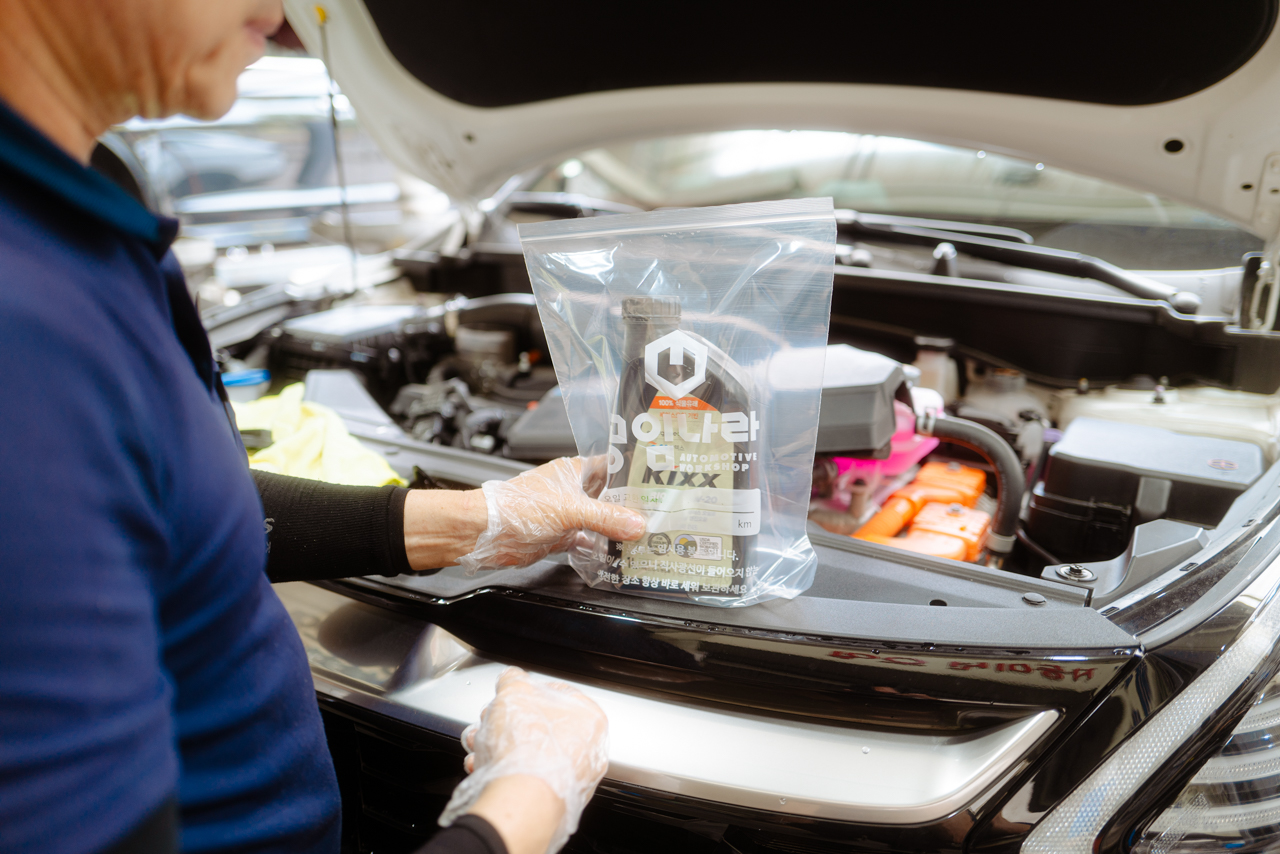 잔유제거 끝난 후 내가 구매해간 킥스바이오1 0W-20을 주입해주셨다. 한번에 5통을 다 넣는게 아니라 먼저 4통, 즉 4L를 먼저 넣고 오일상태를 측정한 후 부족한만큼 더 넣어주어야 하는데, 통상적으로 스포티지 하이브리드 NQ5같은 경우엔 4.5L를 넣는게 좋다고 하셨다. 내가 4.8L은 안대나요? 물어보니깐 더 넣어도 상관은 없는데 하브모델들은 이 정도만 넣어야 경쾌한 주행질감을 느낄 수 있다고 하셨다. 더 넣으면 무겁다고 하셨음.