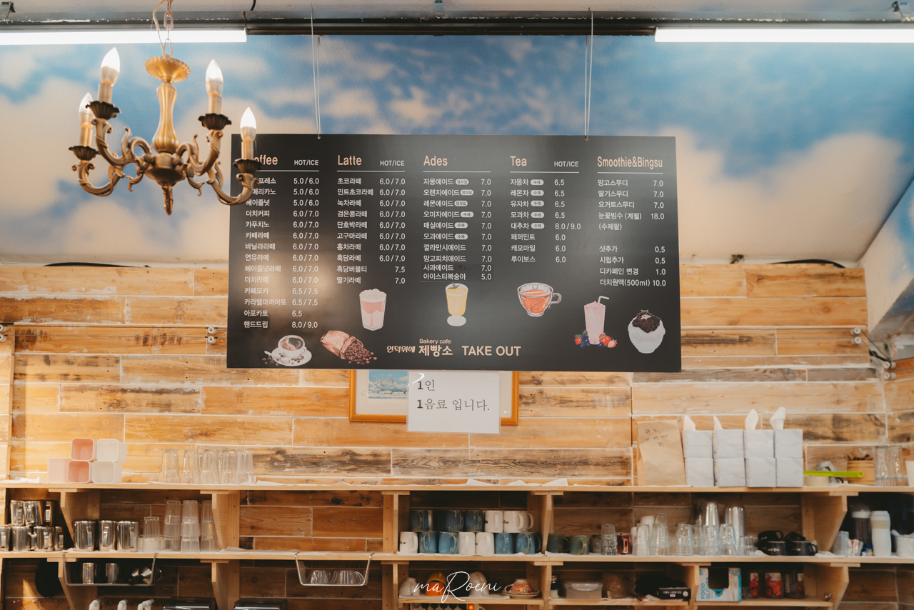 메뉴판. 이젠 빵 가격과 음료 가격이 같은 시대가 되었구나.. 거기다가 1인 1음료 필수라니.. 대형 카페에서 몇만원 쓰는건 우스운 수준이겠다.