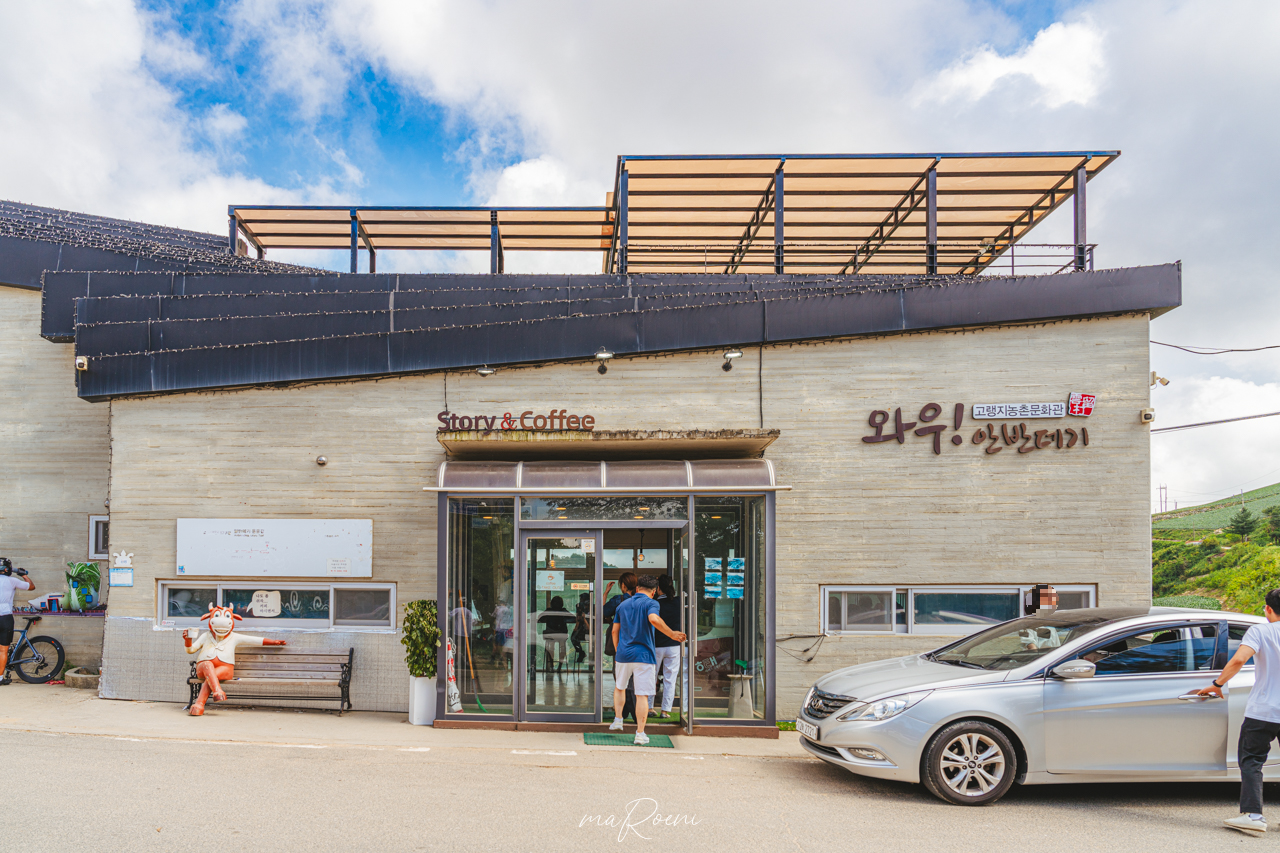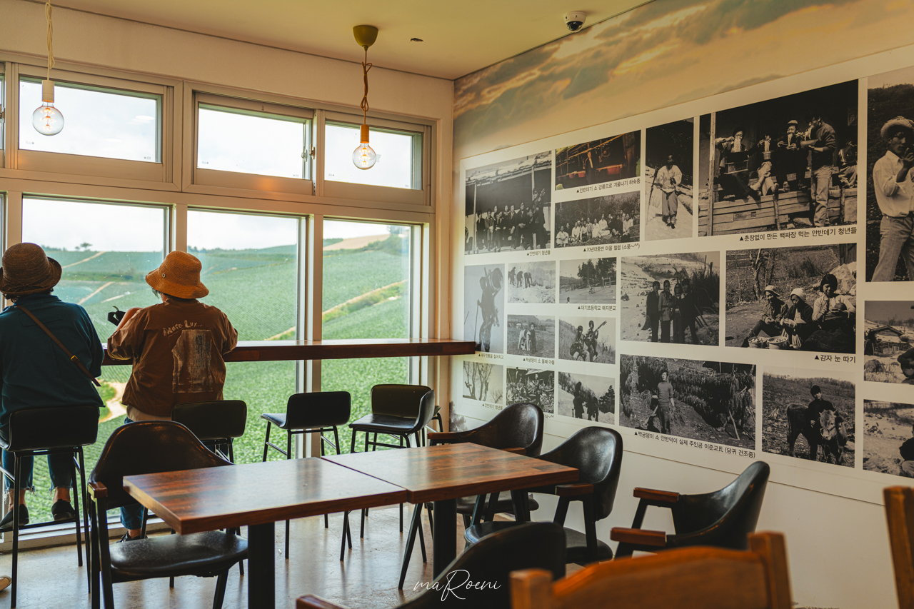 위치나 구조상 우리가 알고 있는 도시의 대형 카페처럼 인테리어가 화려하지는 않지만, 안반데기의 역사와 유래가 담겨있는 벽면과 고랭지 배추밭을 바라보는 뷰는 오직 안반데기에서만 즐길 수 있는 볼거리가 아닐까싶다.
