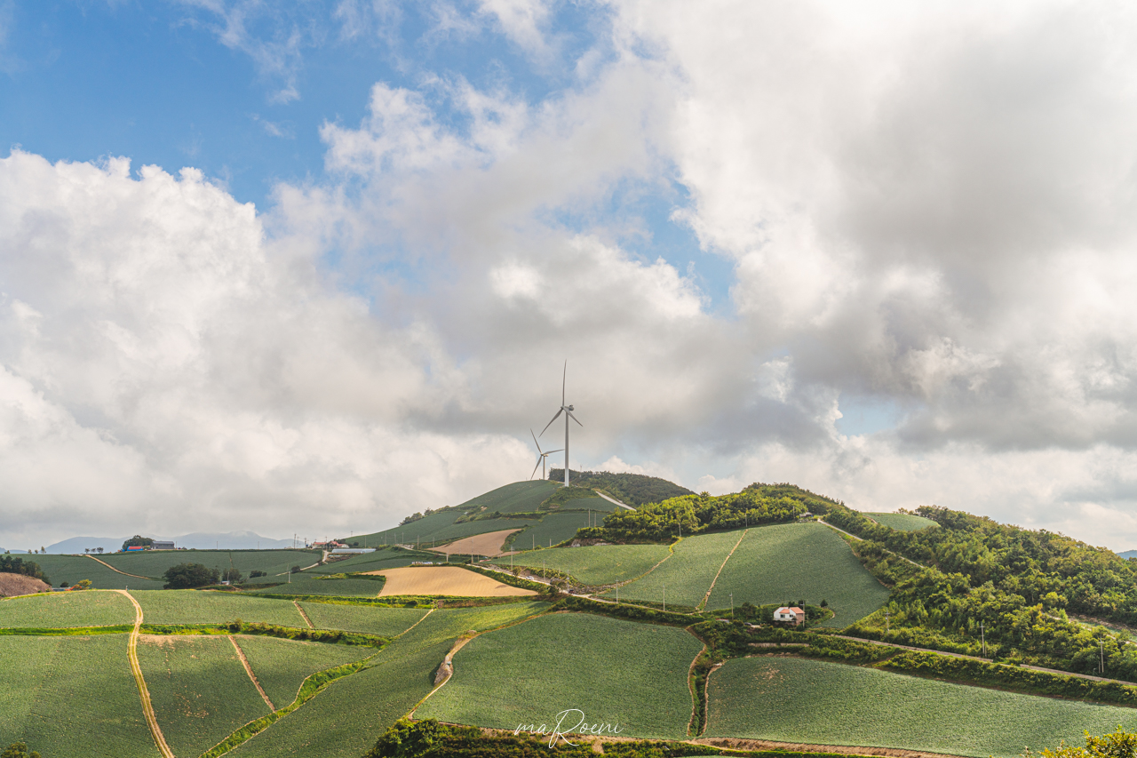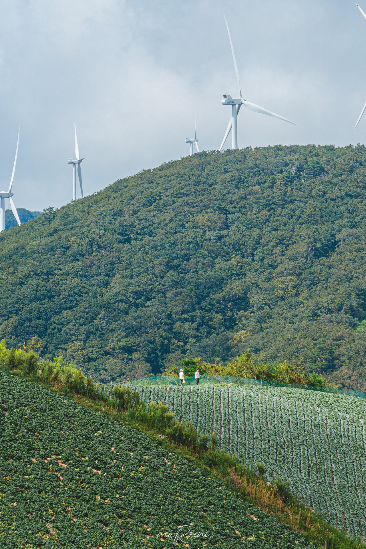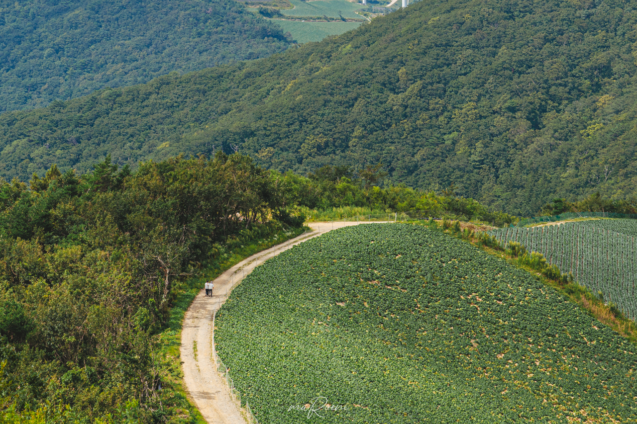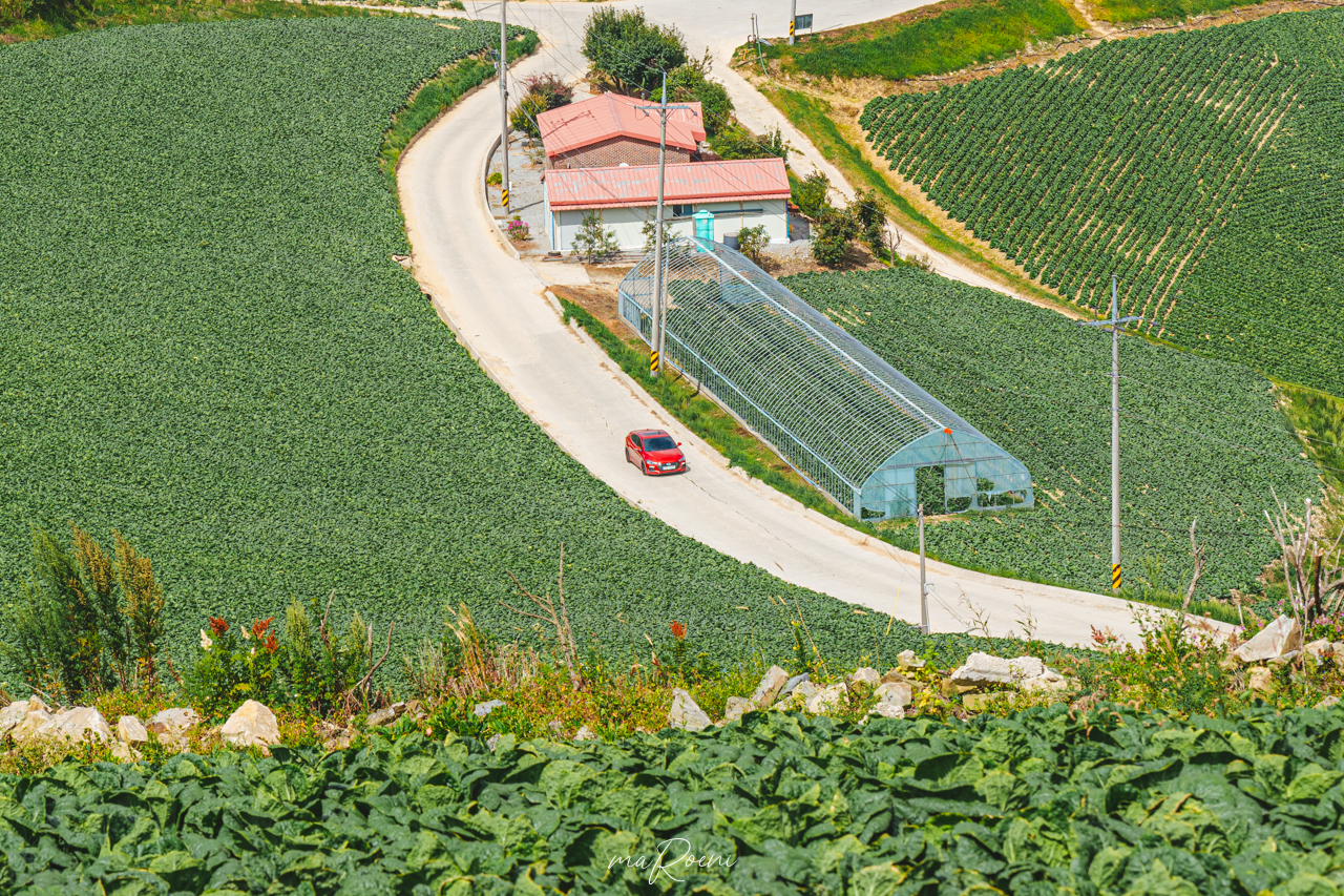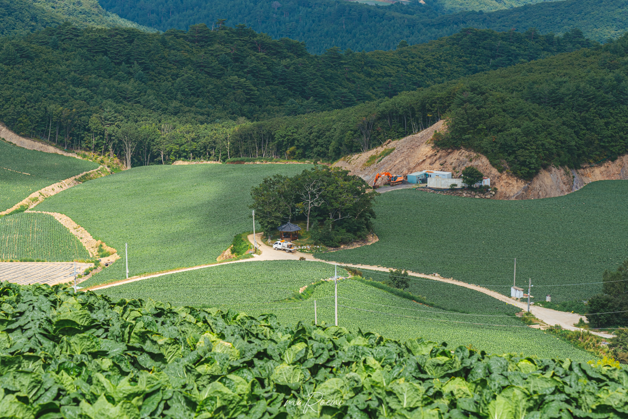 탁 트여있는 푸른 하늘과 쏟아지는 빛을 있는 그대로 받고있는 배추들. 진짜로 첨에 주차하고 내리기 전까지는 안반데기 능선이 전부 다 초록초록이길래 그냥 잘 관리되어 있는 옥수수밭정도인줄 알았다. 여기서 자라나는 배추로 만든 김치는 얼마나 시원하고 맛있을까?