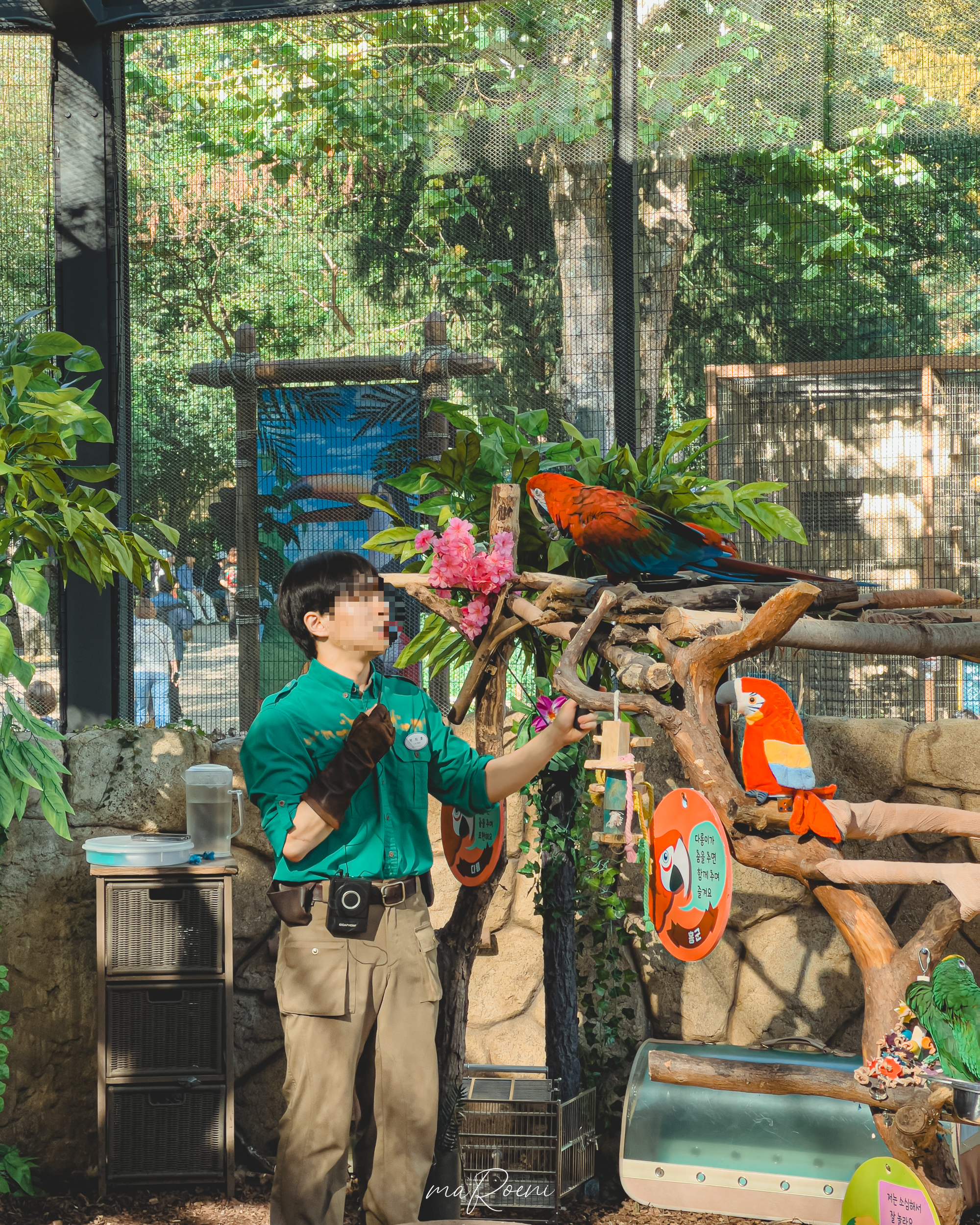 좀 걷다보니 새들이 자유롭게 날아다니는 거대한 새장이 있더군요. 들어가 봤습니다. 안에는 앵무새 조련사분이 계셨고 아이들과 어른들 앞에서 앵무새의 나이는 몇 살인지, 어떤 말을 할 수 있는지 설명해 주셨습니다. 저도 여기서 처음 알게 된 사실인데, 앵무새의 평균수명이 생각보다 길더군요. 제가 제대로 들은게 맞다면 저 앵무새는 20살도 넘었다는..