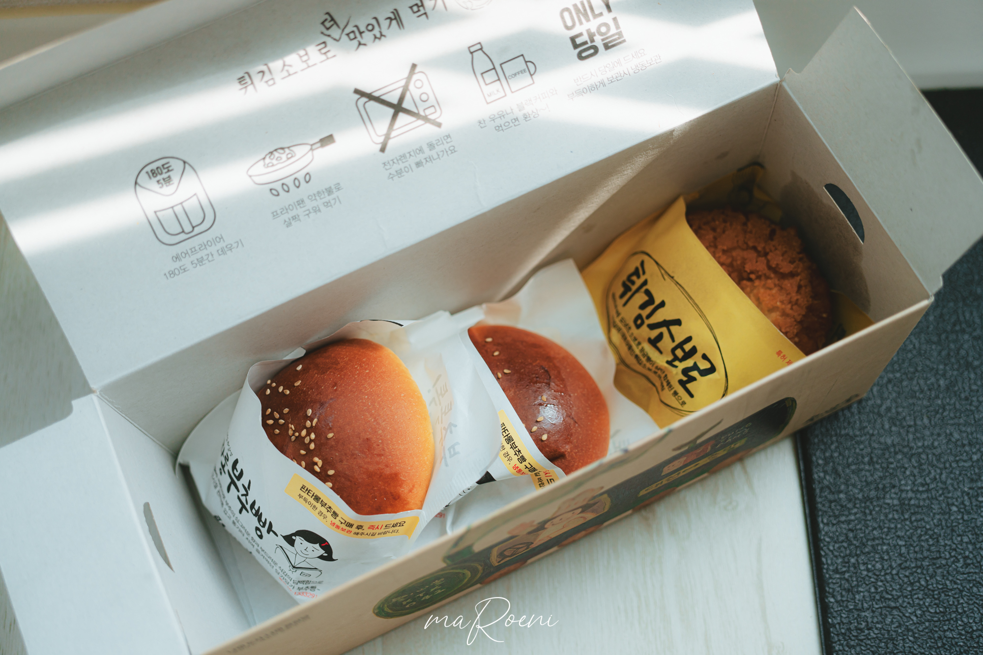 열어보면 성심당 빵을 더 맛있게 먹는 방법이 쓰여있고 안에는 부추빵X3 튀김소보로X3이 포장되어 있어요. 패키징도 이쁜데 빵도 하나하나 손이 더럽혀지지 않게 먹을 수 있도록 개별포장 되어있어서 더욱더 고급스러워 보였어요. 배가 고파서 하나 먹고 2개는 지인들도 맛보라고 나눠줬습니다.