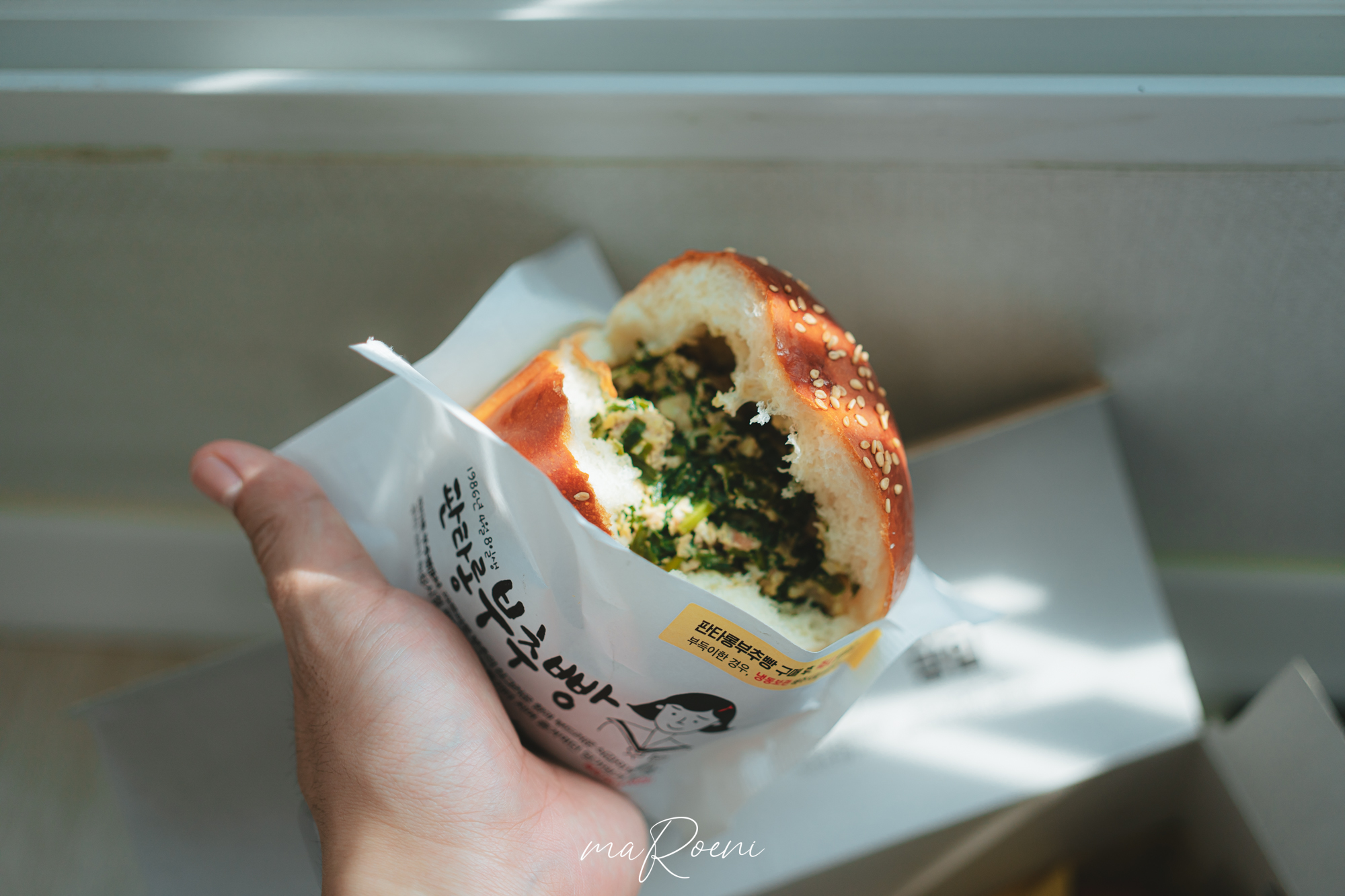 성심당에선 튀김소보로만 유명한줄 알았더니만 부추빵도 제법 인기가 많은 모양이더라구요. 겉은 단팥빵같은데 내용물은 아주 많은 부추와 고기로 채워져있었습니다.