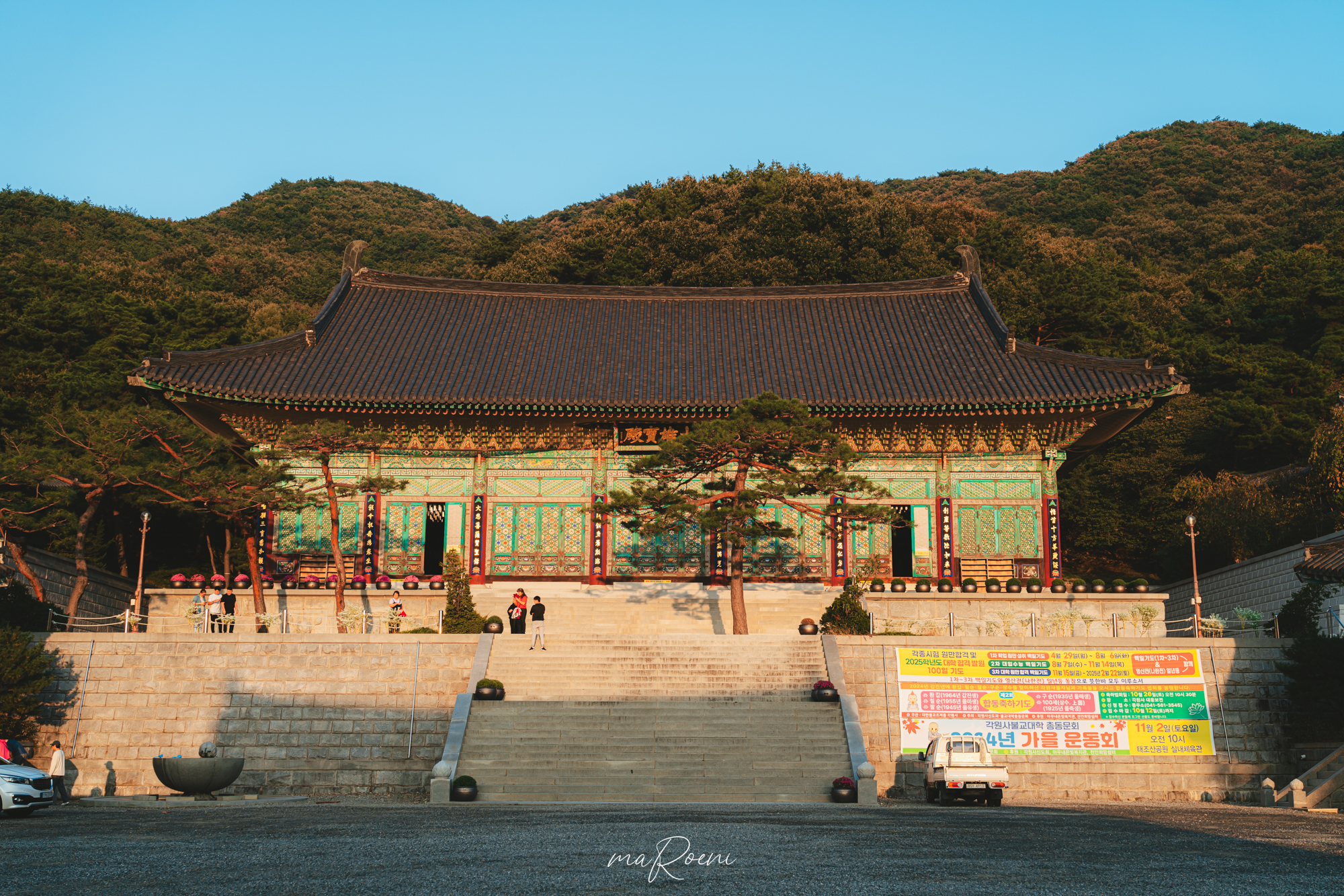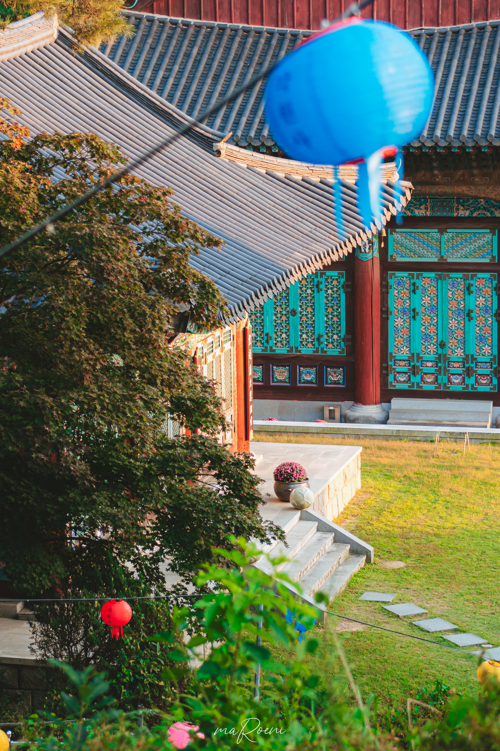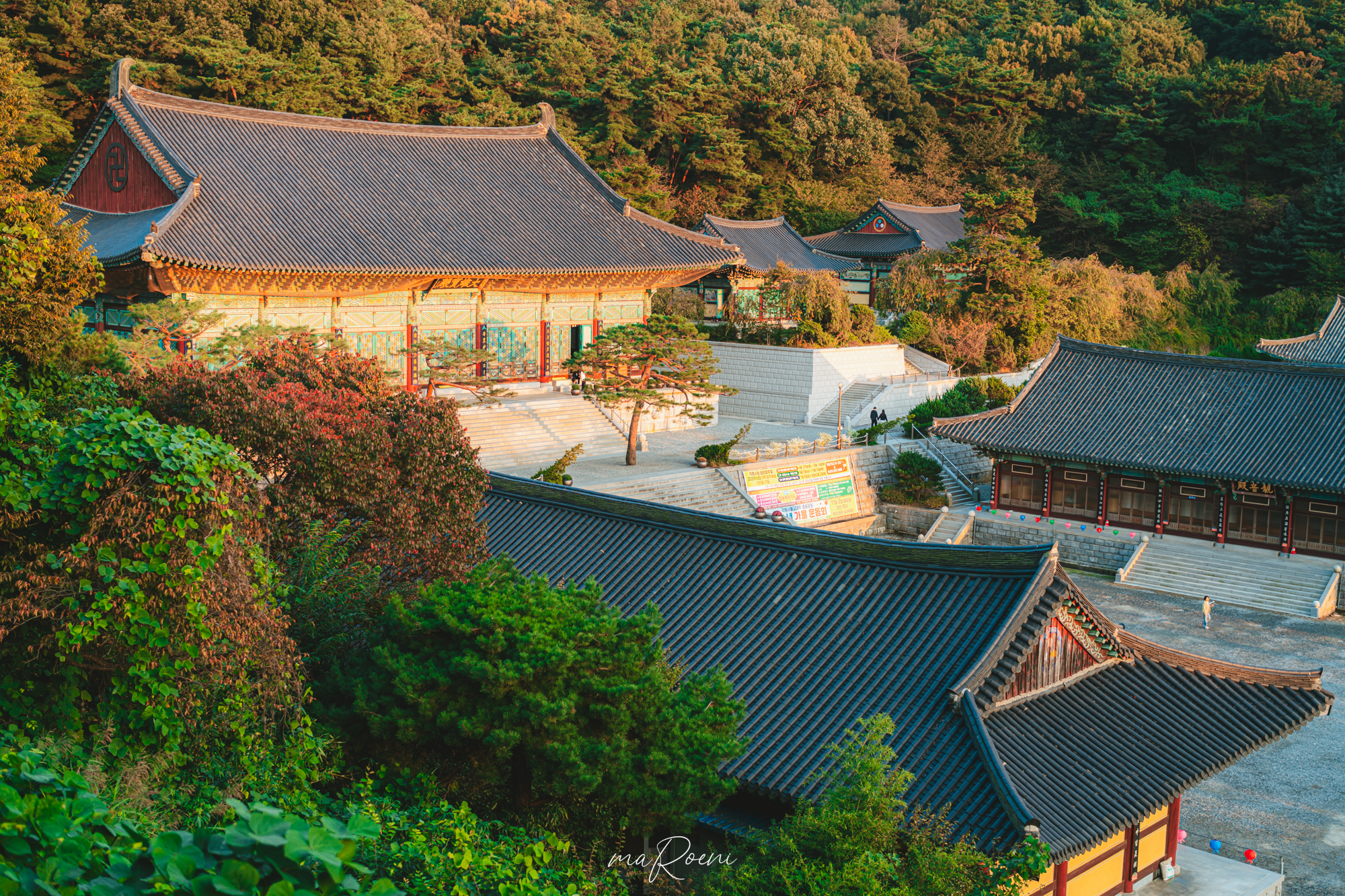 천안 구석구석을 돌아다니던 중 발견한 장소였는데, 운이 좋게도 노을이 지는 시간대와 딱 맞아떨어져서 황금색으로 빛나는 각원사를 카메라로 담을 수 있었답니다.