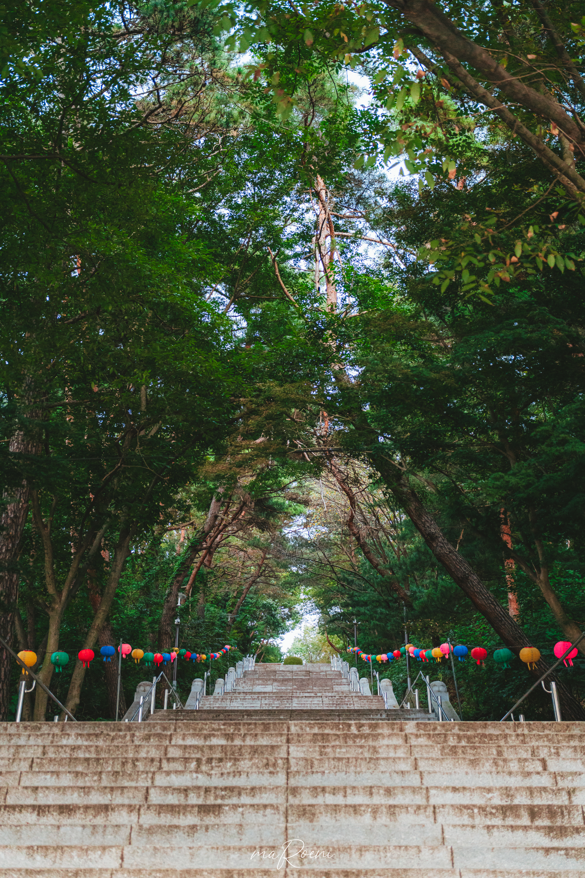 차를 가지고 약 100대의 차량을 주차할 수 있는 각원사 주차장까지 원큐로 이동할 수 있지만 사진에 있는 203개의 계단을 이용하는 방법도 있습니다. 저희는 차량을 이용해서 올라가보기도 했고, 나중에 다시 되돌아 나오면서 아래에 차를 주차하고 계단을 오르내리기도 했어요.