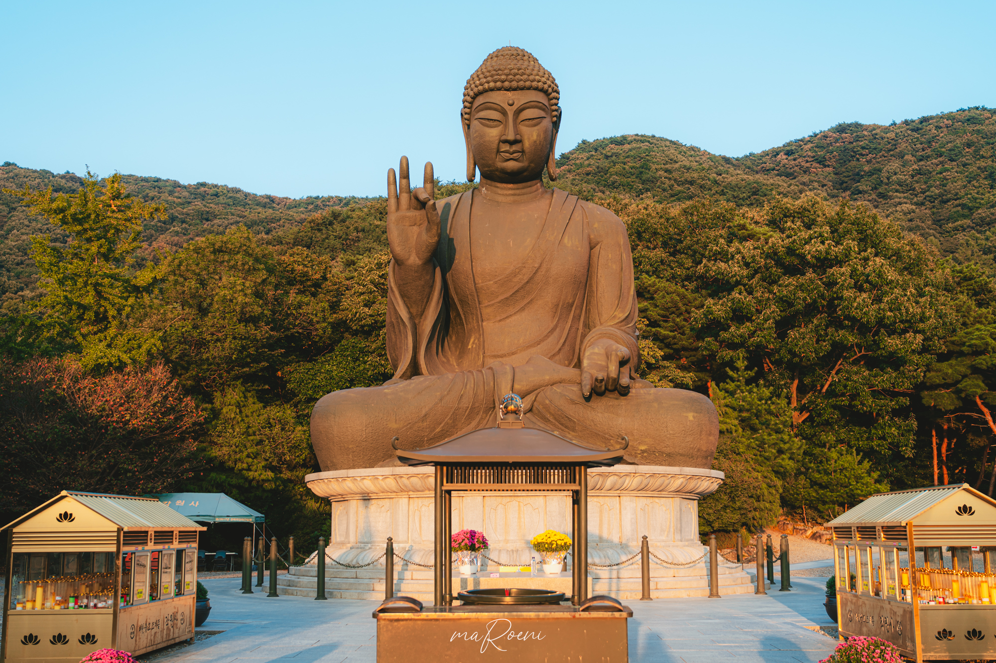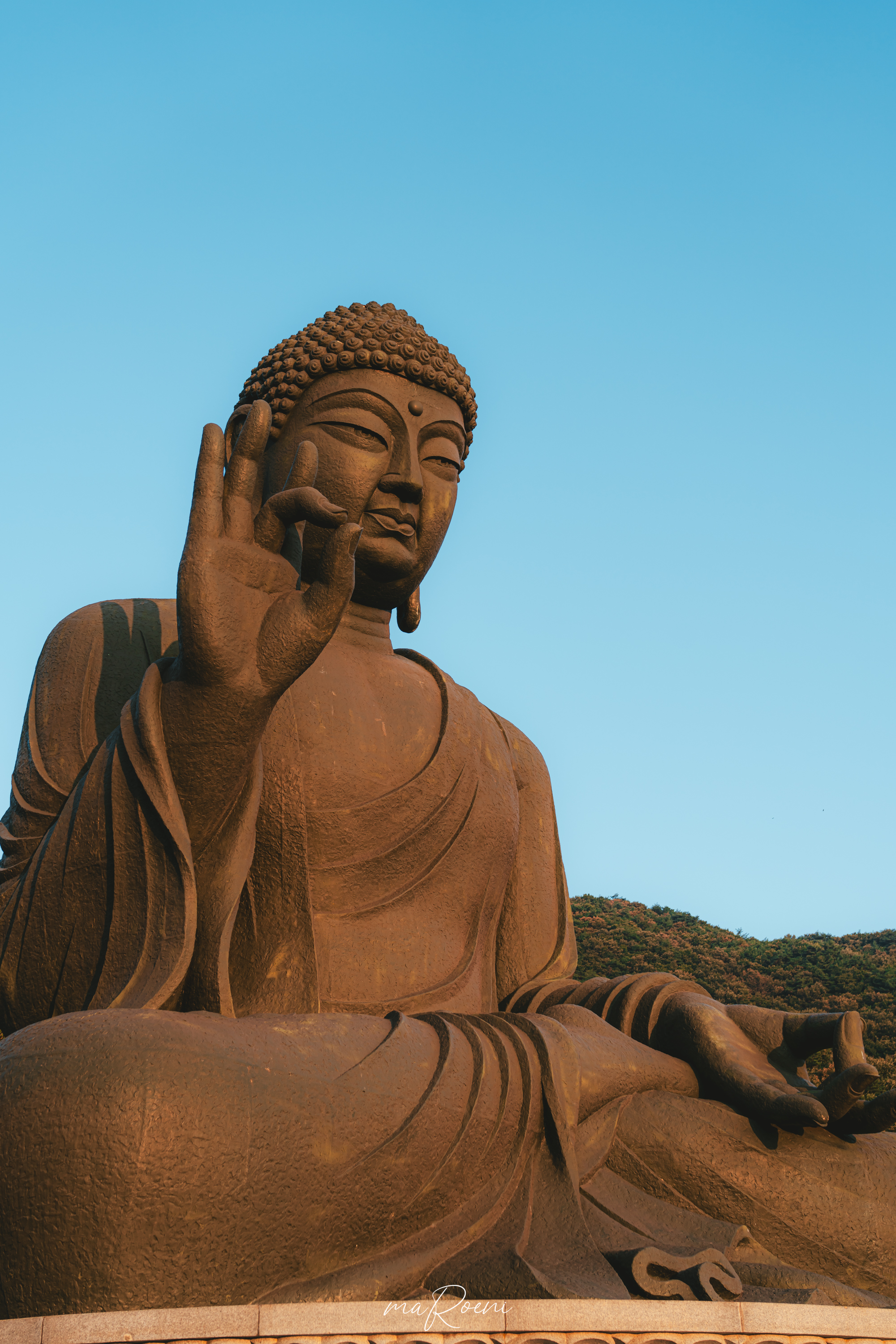 계단 끝에는 각원사 방문자들의 발걸음을 잠시 멈추게 만드는 커다란 불상이 있습니다. 태조산 청동 대좌불이라고 하는 이 불상은 홍익대학교 미술대학교 최기원 교수가 제작하였다고 하며 높이가 15M, 무게가 60톤에 달한다고 해요. 저는 이 불상의 존재를 모르고 천안 각원사를 방문했던 거였기에 불상을 놀랄 수밖에 없었어요.