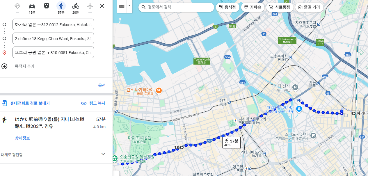 지도만 보면 멀어 보이지만, 막상 오호리공원까지 걸어서 가면 그렇게 멀게만은 느껴지지 않더라구요. 체감온도 40도쯤 되는 한여름이라면 절대 무리겠지만 여름에서 가을로 넘어가는 시점부터는 충분히 걸을만합니다. 저희는 체력이 남아돌아서 왕복 도보로 움직였지만, 체력이 좀 부족하신 분들은 걸어서 오호리공원까지만 걸어가고, 하카타역으로 돌아오는 걸 대중교통으로 이용하시는 게 좋을 것 같습니다.