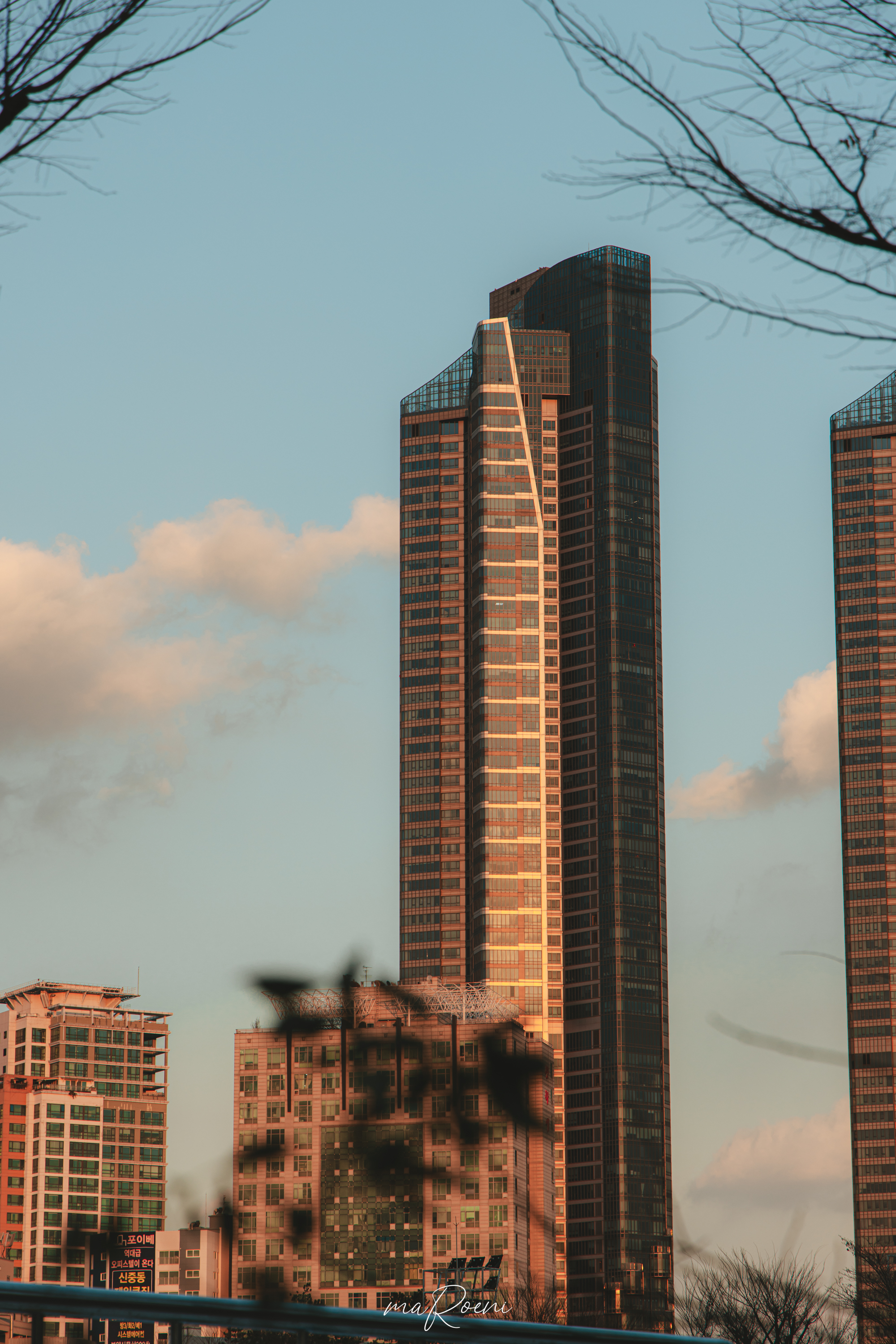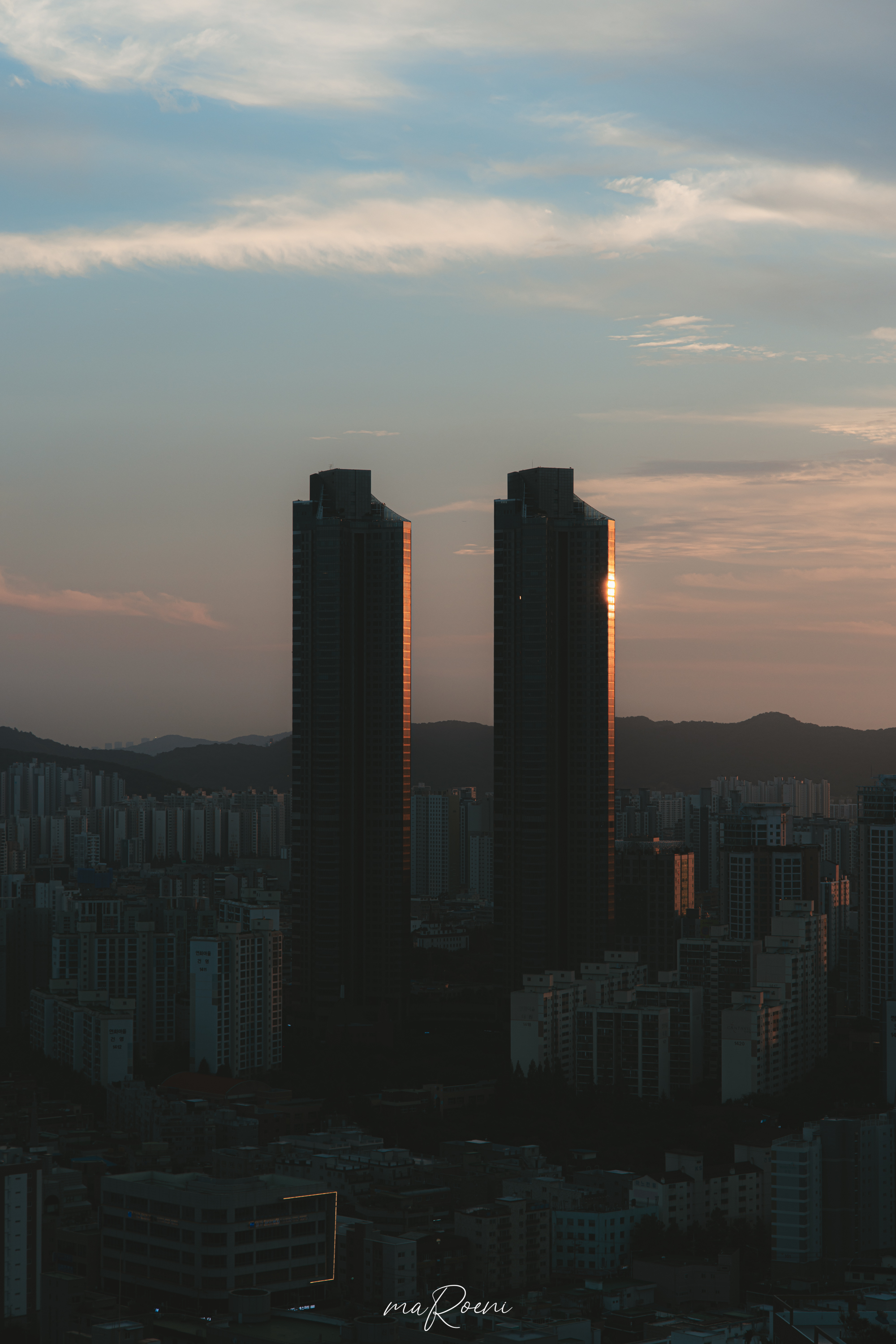 부천에는 반지의 제왕 두개의탑.. 은 아니고 서울 남산에서도 보이는 커~다란 건물 두 개가 있어요. 리첸시아라는 이름을 가진 건물인데요. 예전부터 이 두 개의 건물을 높은 곳에서 찍어보고 싶은 마음이 간절했었어요. 이 동네에서 오래 살았던 마을 주민의 염원이랄까요..