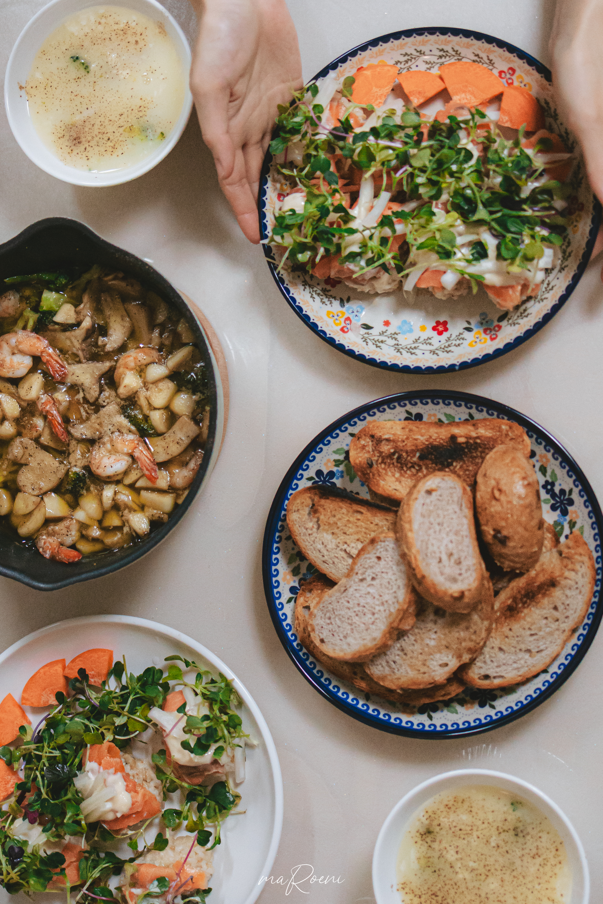 퇴근 후 여자친구가 차려준 샐러드와 감바스. 저는 지금도 이 맛을 기억해요. 가을에서 겨울로 넘어가는 시기라 바람이 정말 많이 불었어요. 그때 저는 차도 없었거든요. 토요일 출근이라 열심히 일하고 퇴근했는데, 전날에 제가 감바스가 먹고 싶다고 살짝 흘려 말한 걸 기억해 뒀다가 제 퇴근시간에 맞춰서 준비해 줬더라고요. 레스토랑처럼 깔끔한 맛(?)은 아니었지만 저에게는 이 감바스가 세상 최고의 감바스였고 그 해 가을 최고의 음식이었어요.