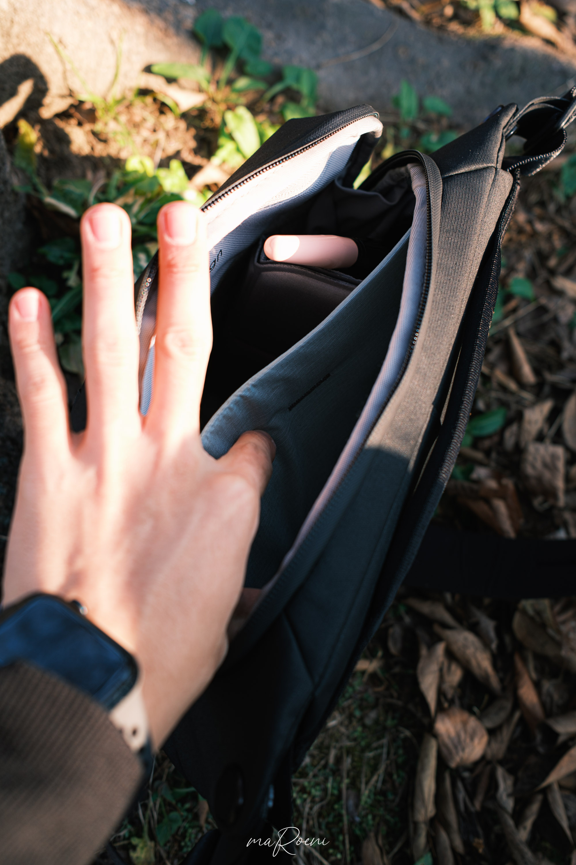 수납력 하나만큼은 정말 좋다고 느낀게, 메인 공간 말고도 위에 배터리나 메모리카드같이 작은 물건들을 넣을 수 있는 보관함이 있고 10인치 이하의 아이패드를 수납할 수 있는 납작한 공간이 있어요. 저는 아이패드까지 들고 다니면 어깨가 박살 날 것 같아서, 여행할 때 받은 중요한 영수증이나 팜플릿 같은걸 저 공간에 보관했는데 넣고 빼기가 진짜 개꿀!! 너무 편리했답니다.