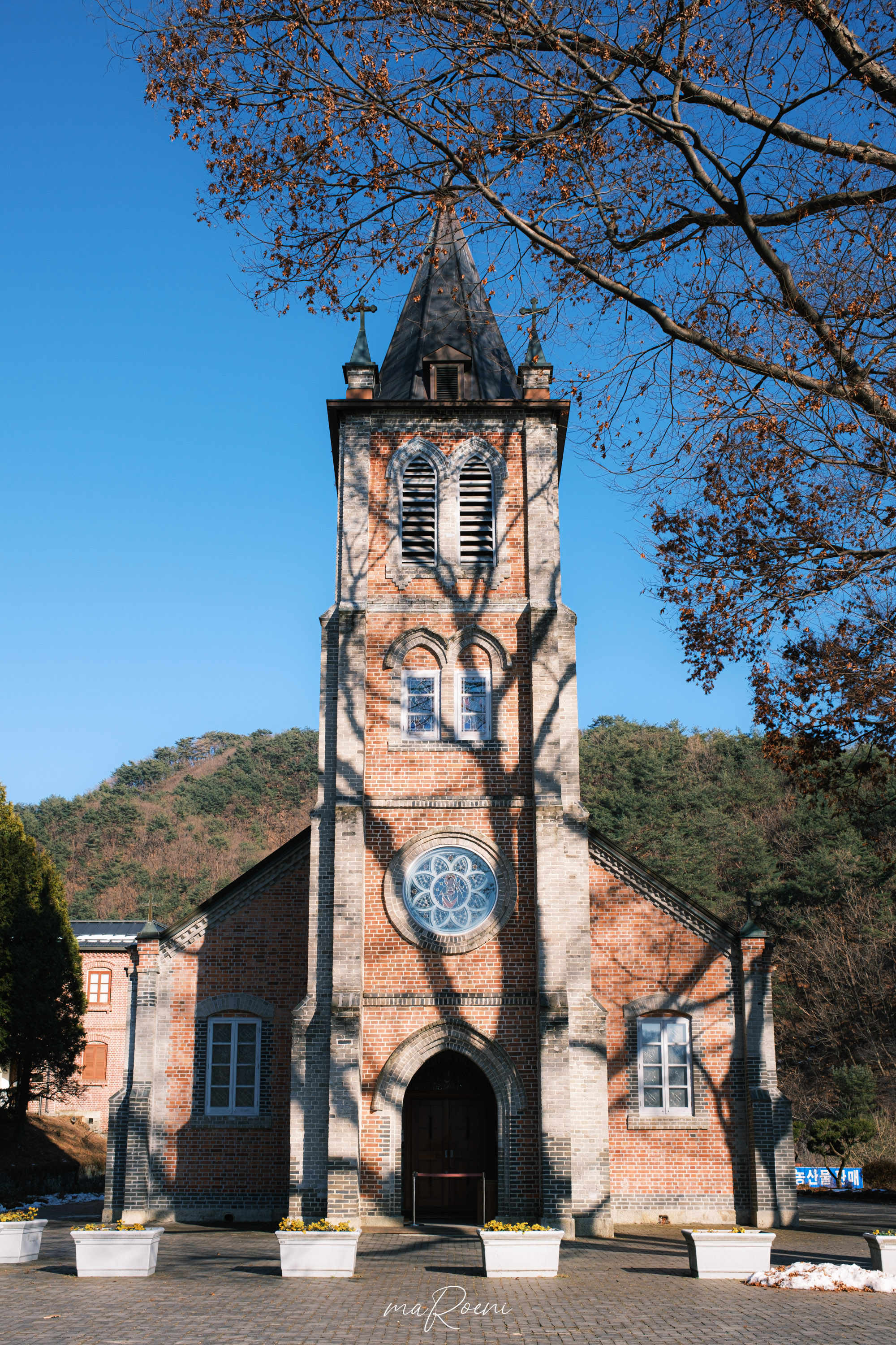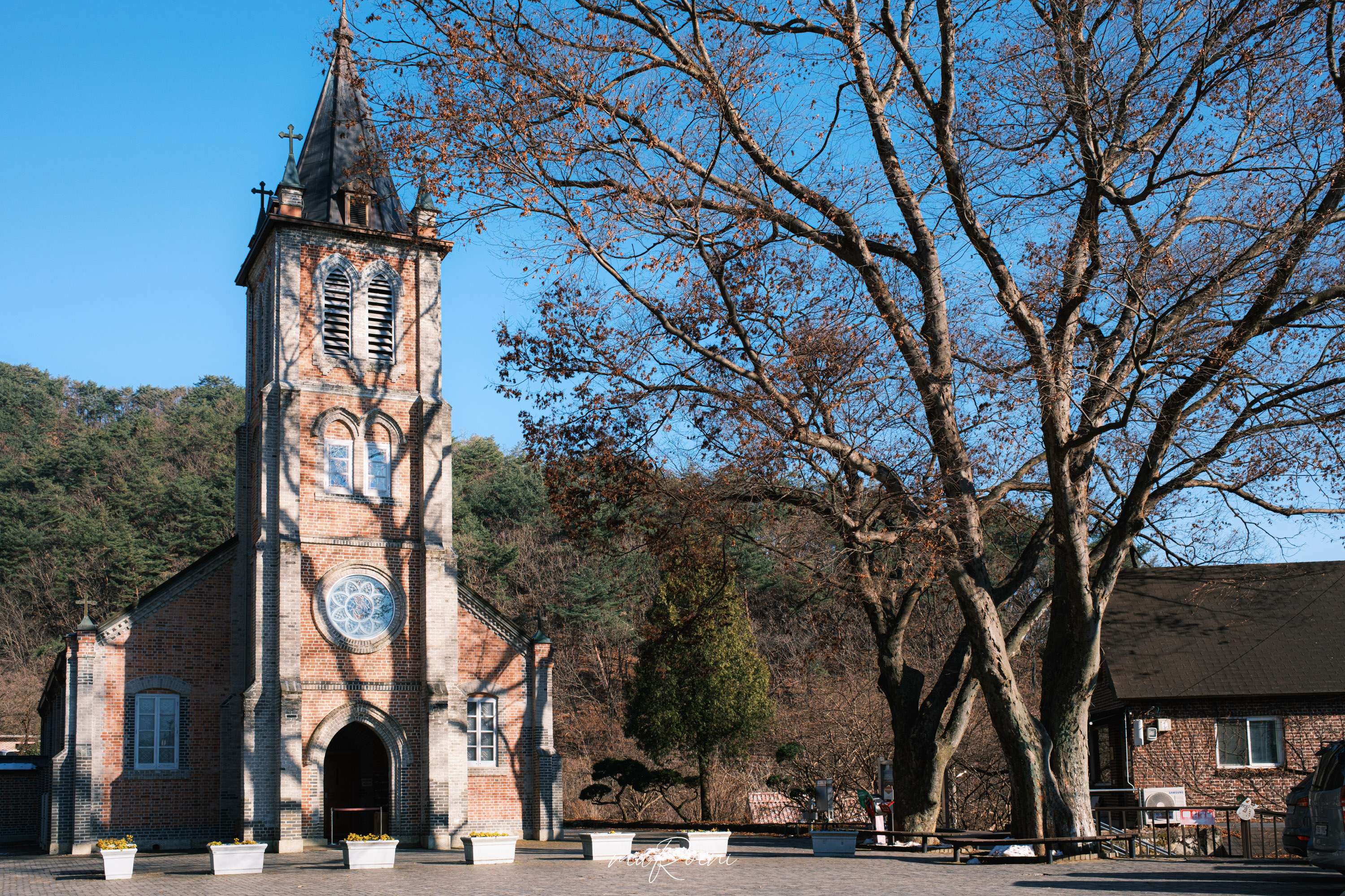 양쪽에 큰 느티나무 두 그루 사이로 우뚝 솟은 풍수원성당. 뷰가 정말 아름답지 않나요? 다른 장소들도 예쁘지만 인증사진을 남기고 싶으신 분들은 이 스팟을 추천드려요.