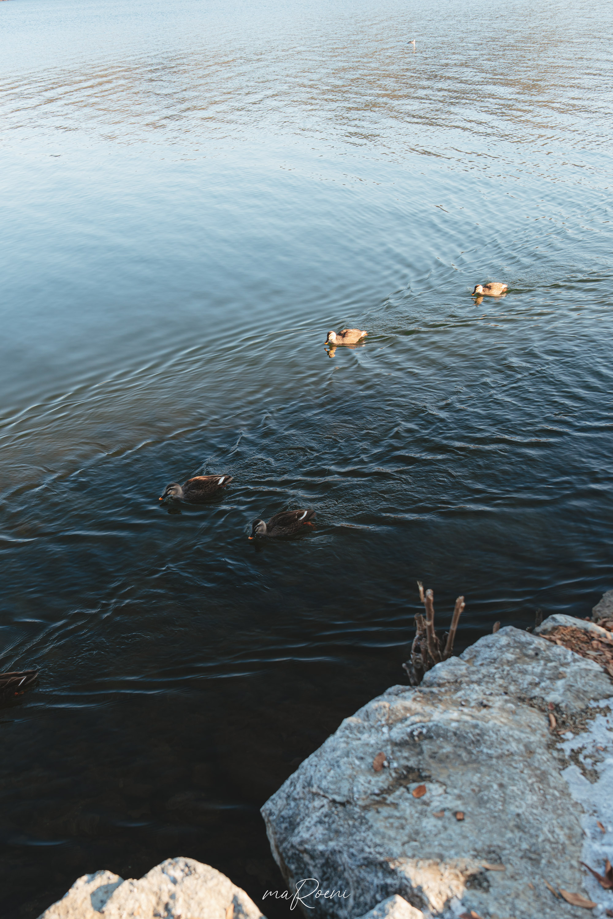 사람들이 물가를 바라보며 사진을 찍길래 저도 봤더니만 오리가족이 헤엄을 치고 놀고 있더라고요. 호수공원에서도 오리들을 보긴 했지만, 다들 그냥 멍하니 둥둥 떠다니기만 해서 보는 재미가 없었거든요. 확실히 움직이는 피사체가 찍는 맛이 있어요.