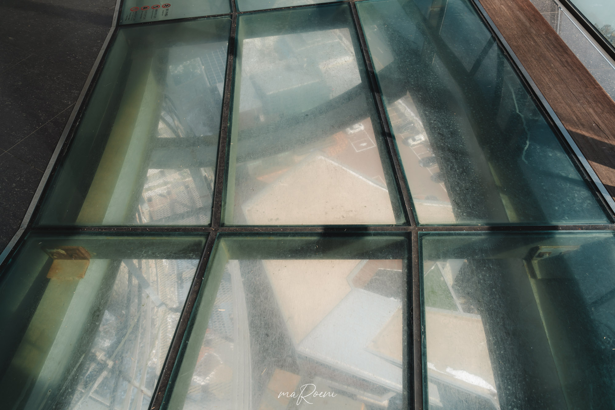 카페 쪽 바닥은 막혀있지만, 반대쪽의 바닥은 투명강화유리로 도배되어 있다. 근데 여기도 상태가 영... 투명이긴 한데 먼지로 다 가려져서 바닥이 안보임.. 투명바닥만 보면 발바닥에 땀이 생길 정도의 고소공포증을 가진 내가 탭댄스를 출 수 있을 정도였으니 말이다.