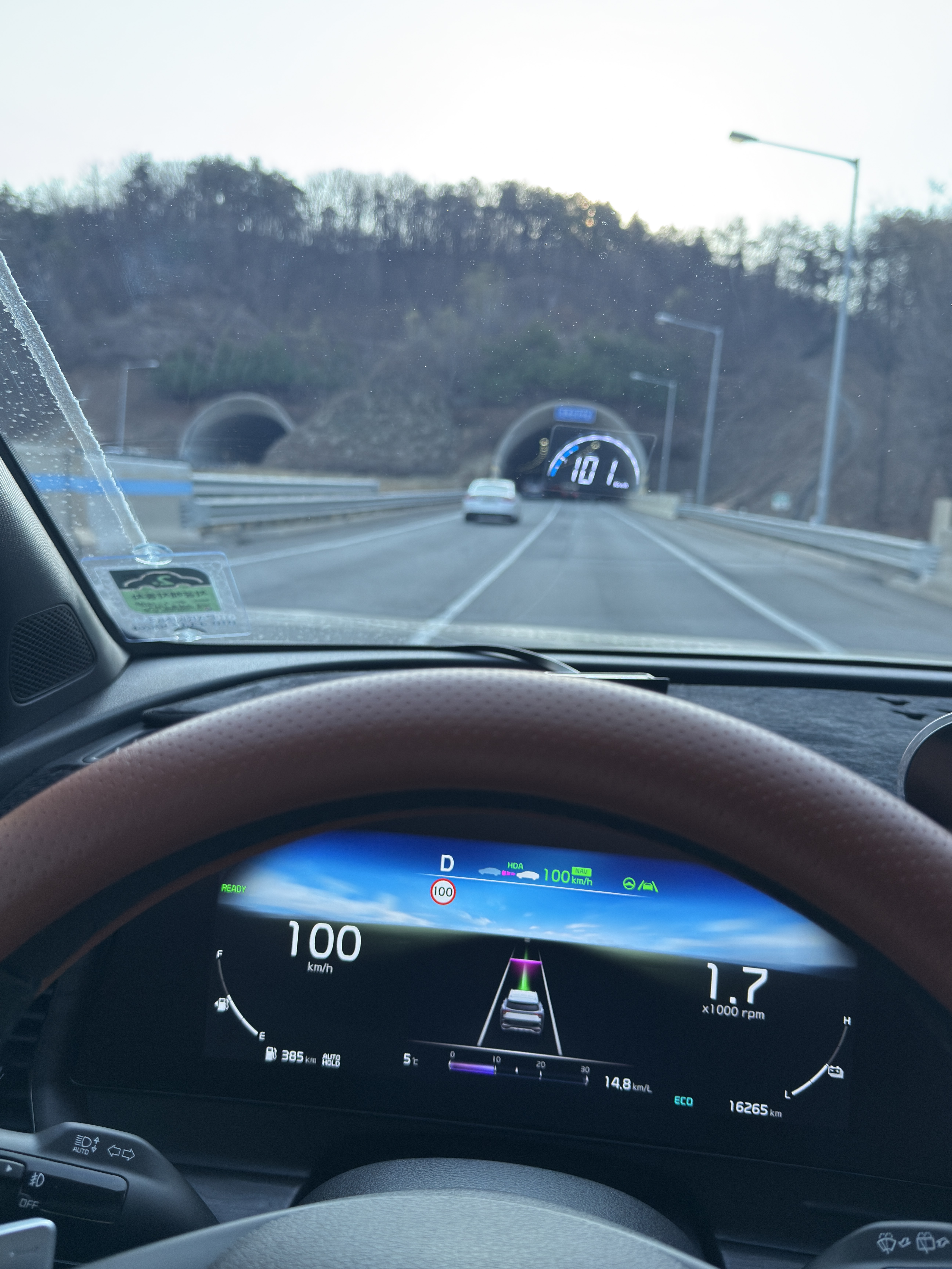 스포티지 NQ5 하이브리드 사제 HUD C300S PLUS를 고속도로에서 테스트해 봤다. 악셀을 밟으면서 확인하는 데에는 어려움이 있어서 고속도로에서 크루즈컨트롤로 속도를 확인해 봤는데, 저속에서는 속도차이가 조금 있지만 고속에서는 어느 정도 계기판과 비슷하게 표시되는 것 같았다.