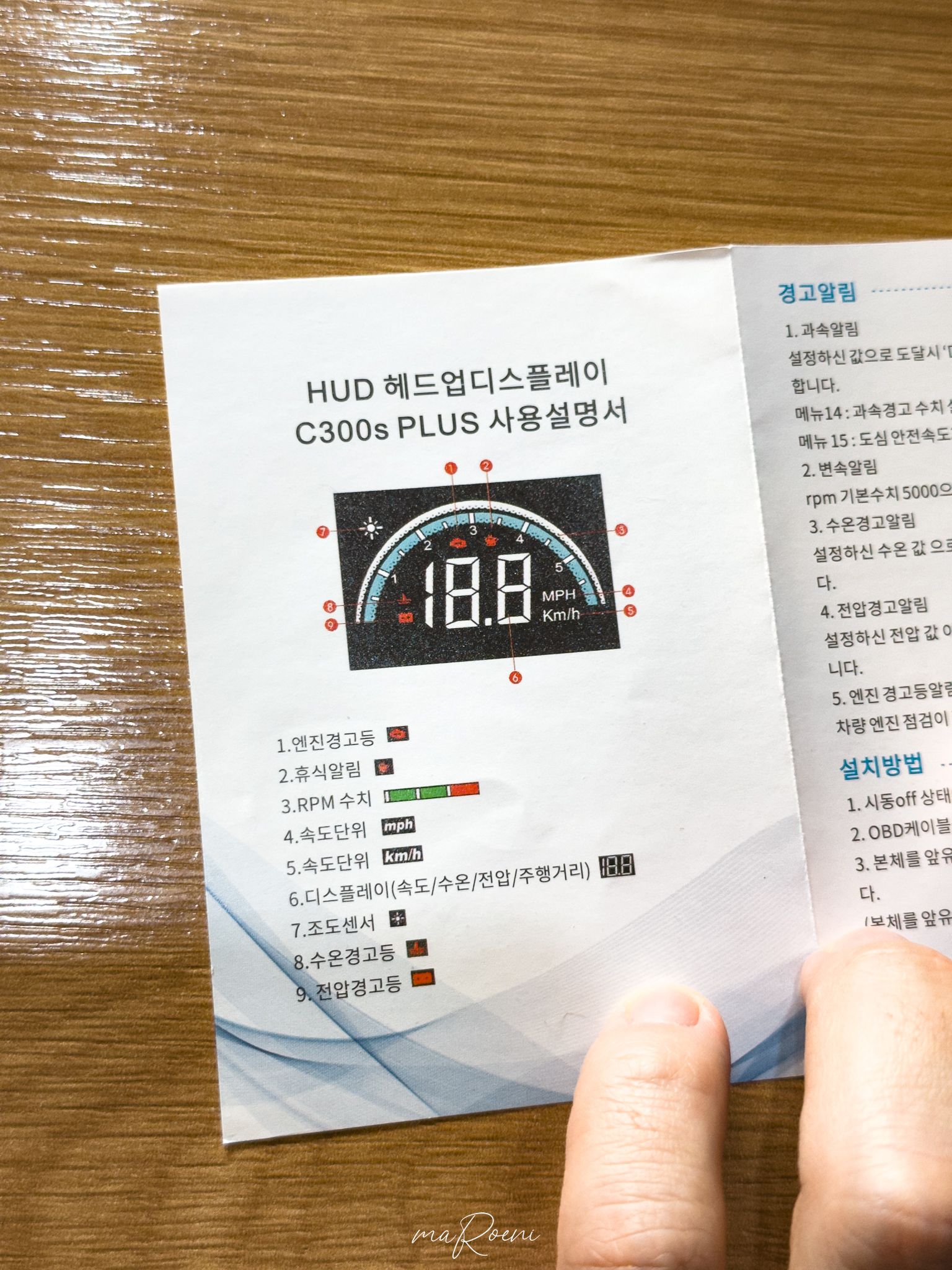 네비 기능까지 탑재된 HUD는 10만원이 넘어가기도 하고 티맵까지 지원되는 HUD는 20만원도 넘어가는 것 같은데.. 그런 기능을 필요로 하지 않고 속도와 RPM만 확인하고자 한다면 C300S PLUS는 무적의 가성비 HUD 모델이 아닐까 싶다.