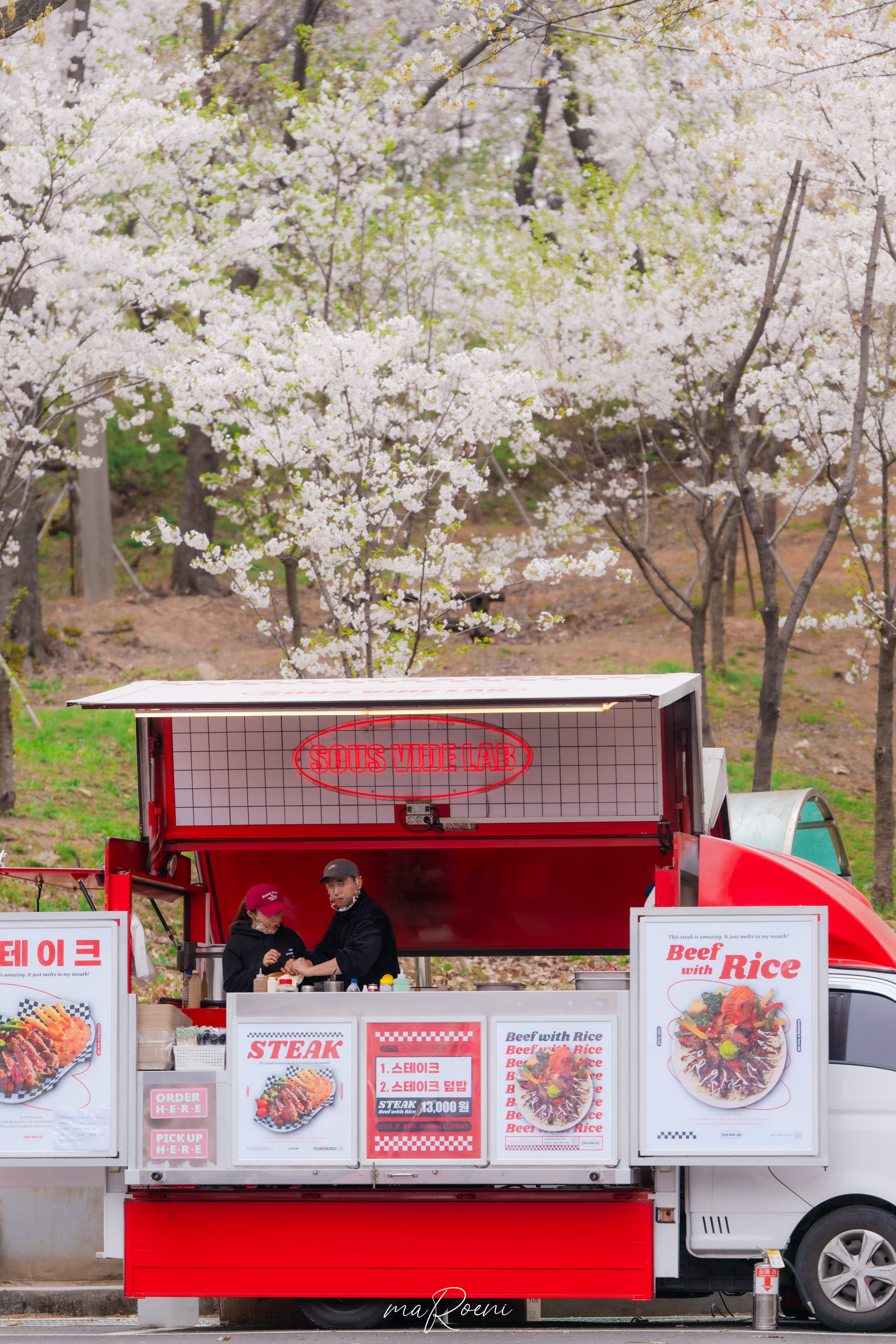 그런데도 도당산 벚꽃축제는 막을 수 없었는지, 중간쯤 공터에 커피나 가볍게 즐길만한 음식들을 판매하는 푸드트럭들이 많이 보였다. 비가 오면 사람들 싹 다 빠질텐데 오늘 장사가 잘 될런지는 모르겠네.