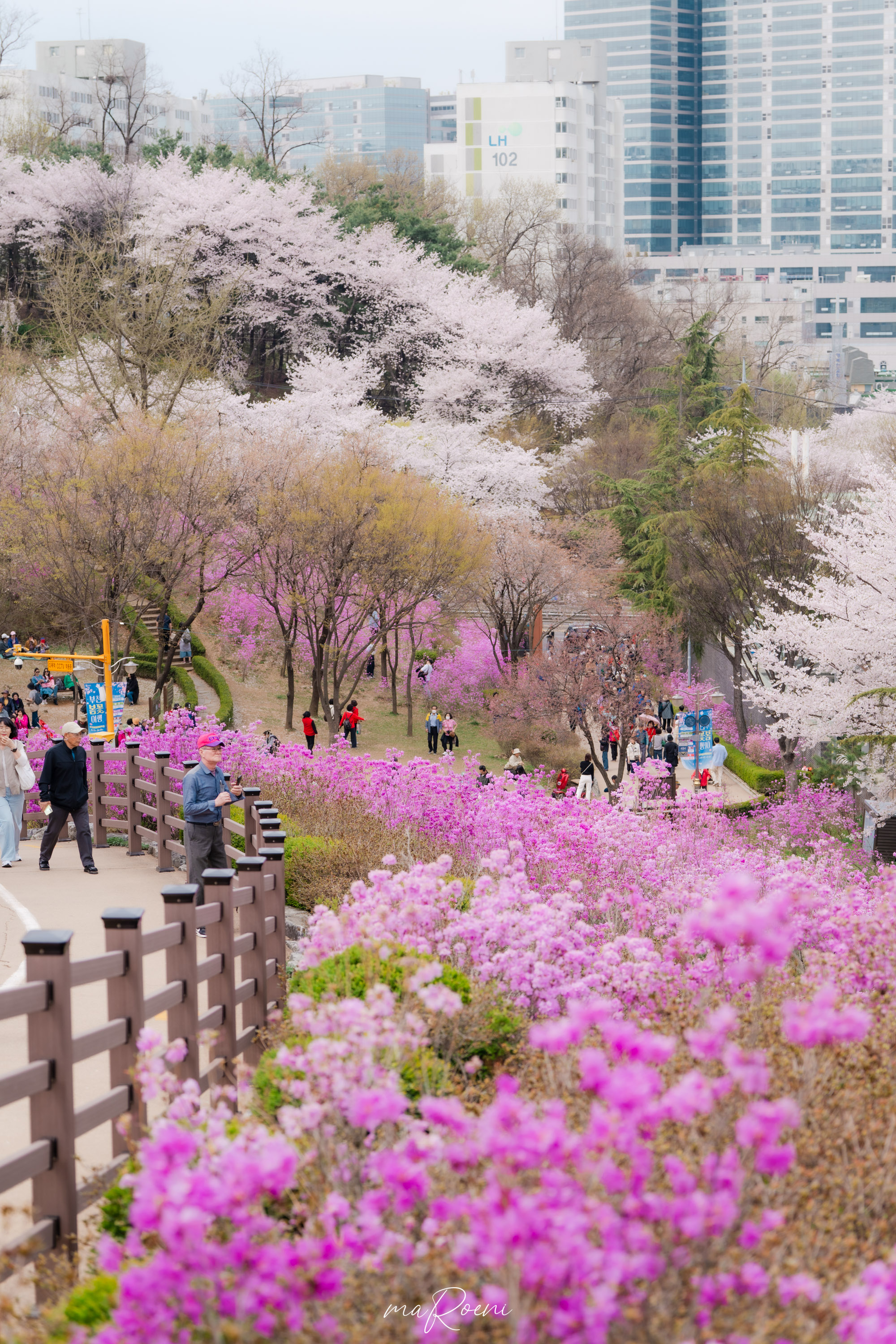 원미산 진달래꽃 축제 개화 상태는 이 정도면 충분한 것 같다. 비가 그치고 나면 온도가 조금씩 올라갈 텐데, 그때가 되면 시들시들 타들어가는 꽃들이 많아질 거라, 벚꽃과 만개한 진달래꽃의 환상적인 콜라보레이션을 보고 싶다면 4월 14~20일 사이에 방문하는걸 적극 추천하고 싶다.