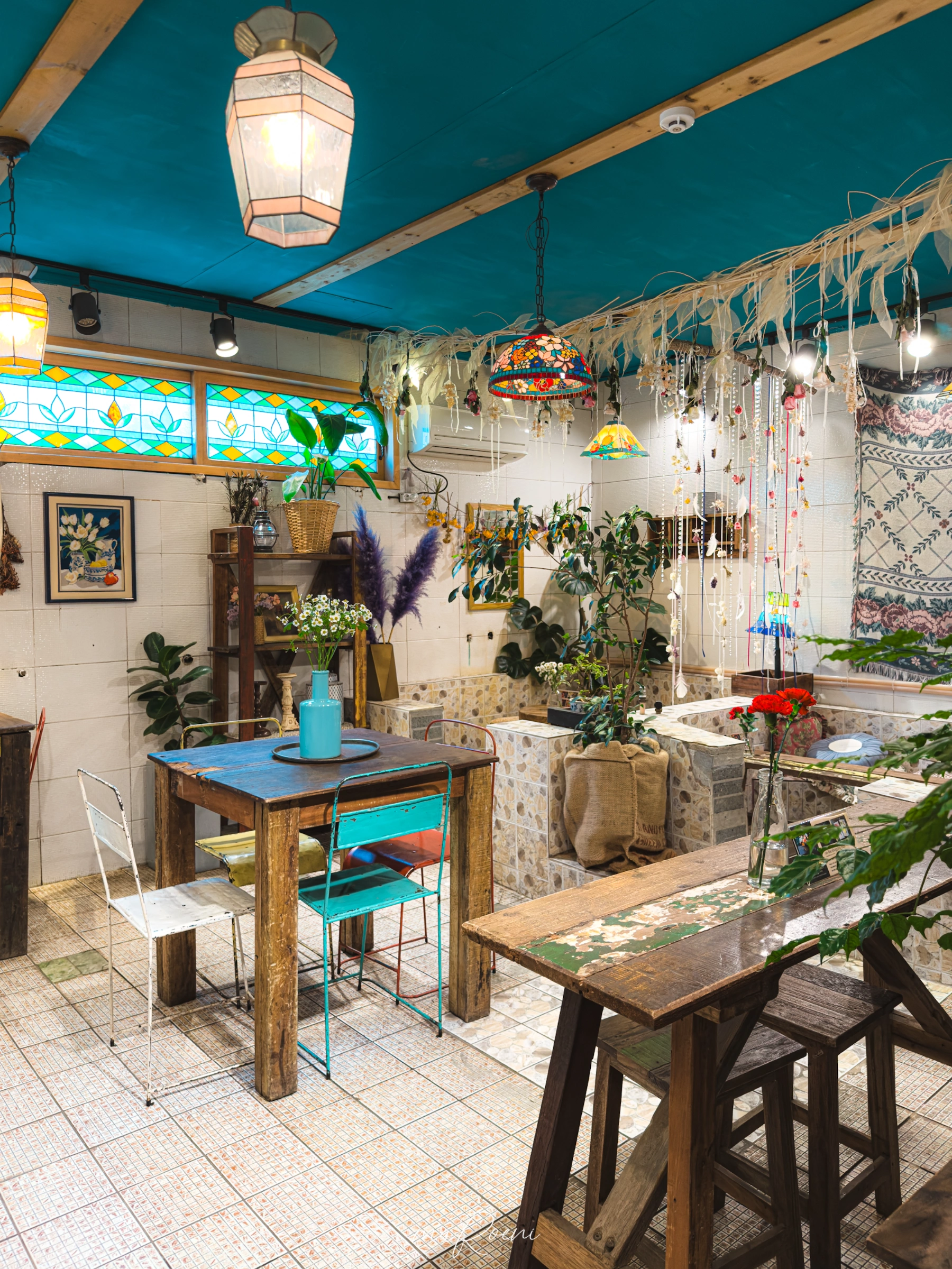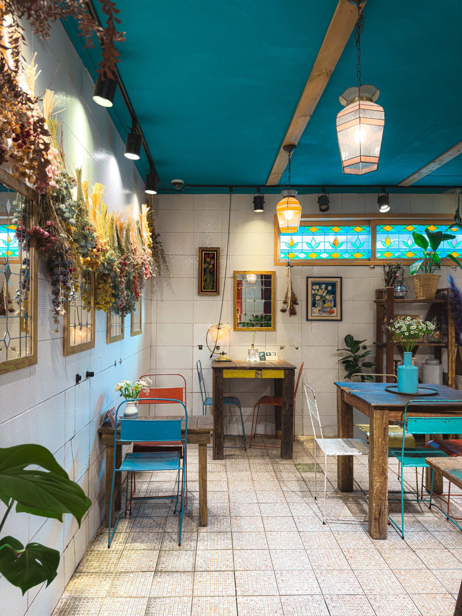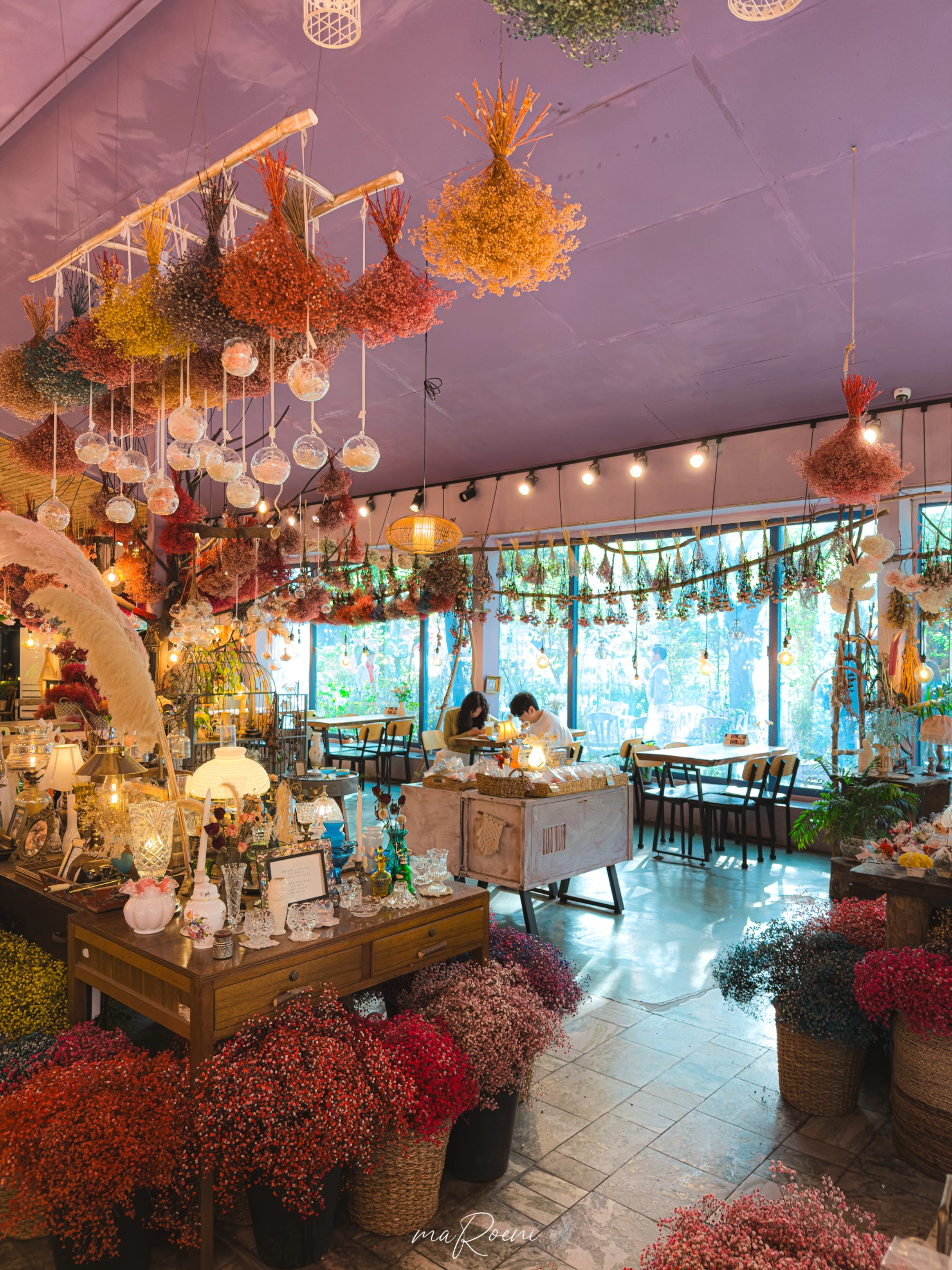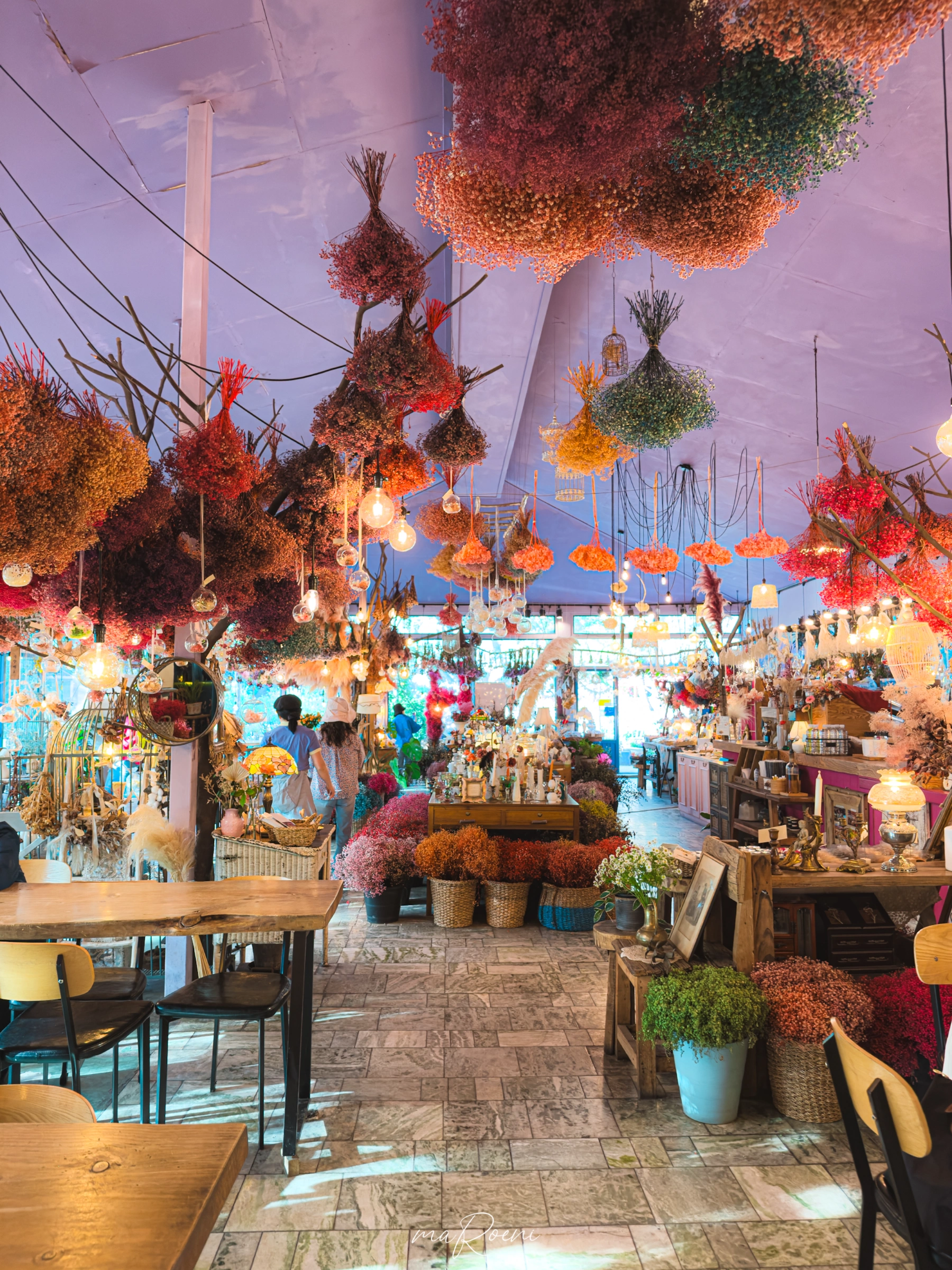 먼저 입구로 들어가면 식물들이 가득한 아날로그 빈티지샵같은 분위기가 첫인상임. 분위기 진짜 구리면 그냥 구경만 하고 나가려고 했으나, 천장에 달려있는 말린식물+조화+핑크핑크한 감성이 우리를 여기서 못 벗어나게 하더라. 그래서 자리 잡고 이 분위기를 조금 더 즐겨보기로 하였다.