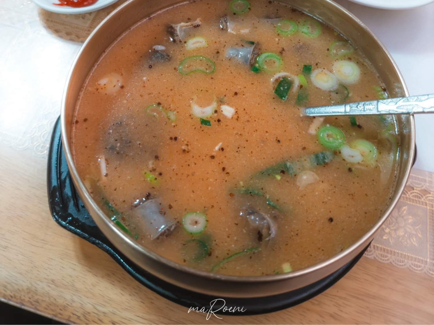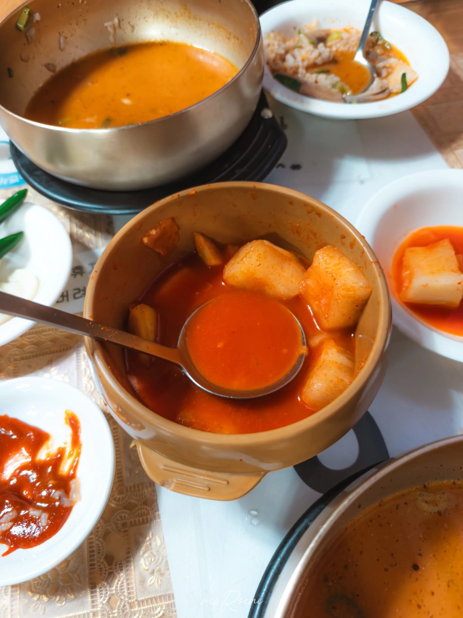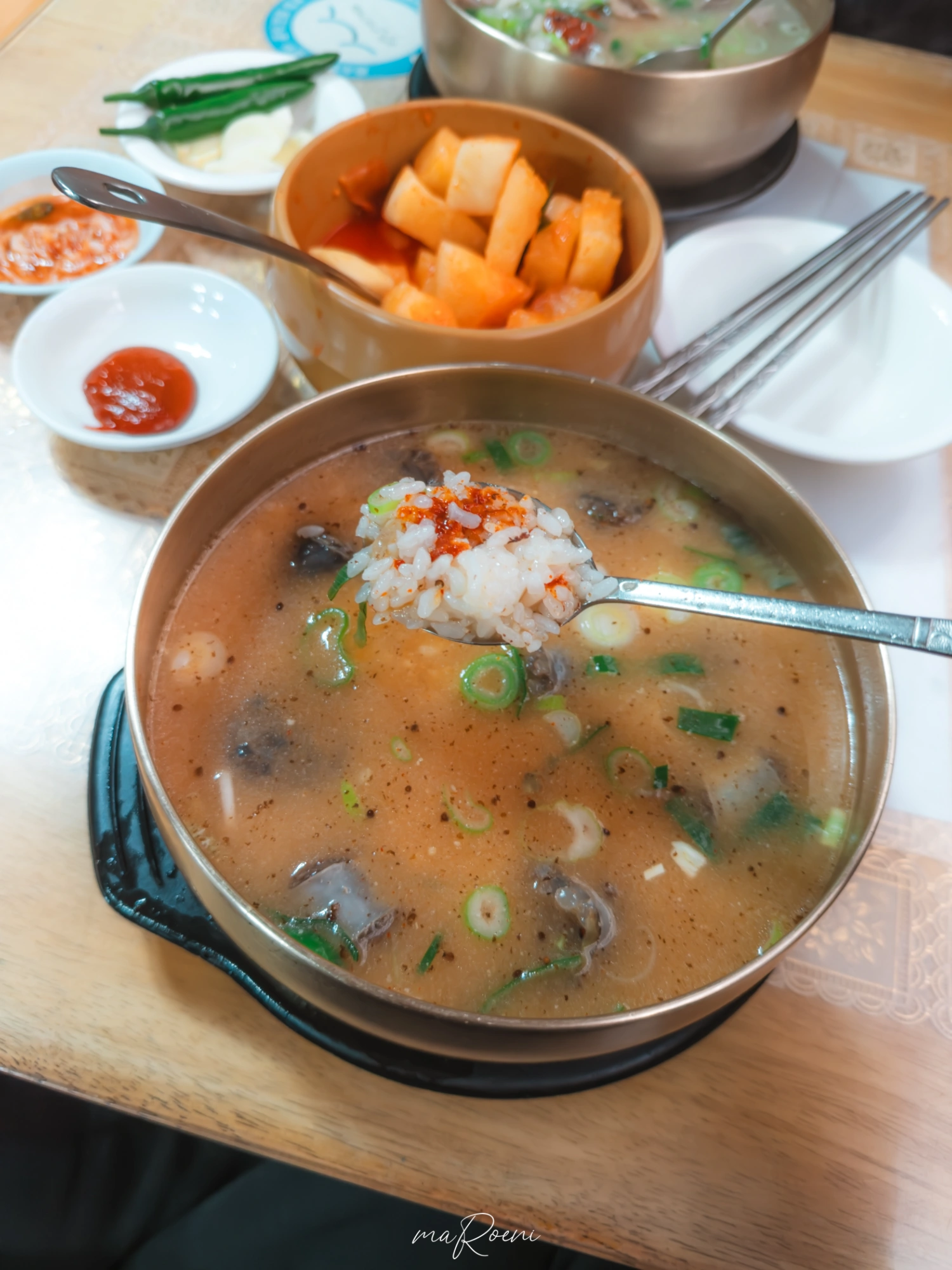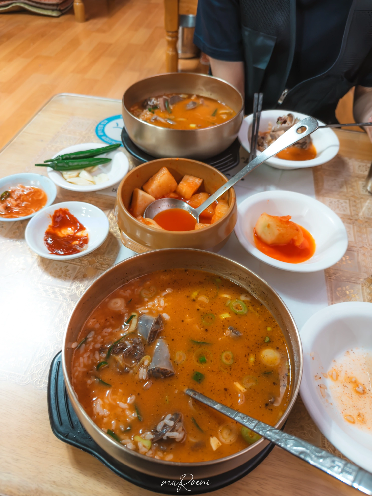 반찬은 뭐 그저 그럼. 깍두기는 항아리에 담아져서 주는데 맛도 그냥 어디에서나 쉽게 먹어볼 수 있는 깍두기 맛 자체임. 새 국자를 받았음에도 불구하고 국자 손잡이에 고춧가루가ㄷㄷ;; 위생적으로는 좀 그렇긴 한데 이런 동네 식당에서 이 정도면 그냥 허허 웃으면서 넘어갈 수 있는 수준이라 고춧가루도 개걸스럽게 핥아먹었음.