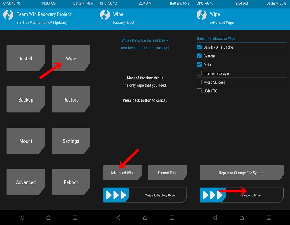 8) 이 상태에서 메인 메뉴-Wipe-Advanced Wipe로 들어간 후 Dalvik/ART Cache, System, Data를 체크하고 스와이프하여 캐시 파일을 삭제해줍니다.