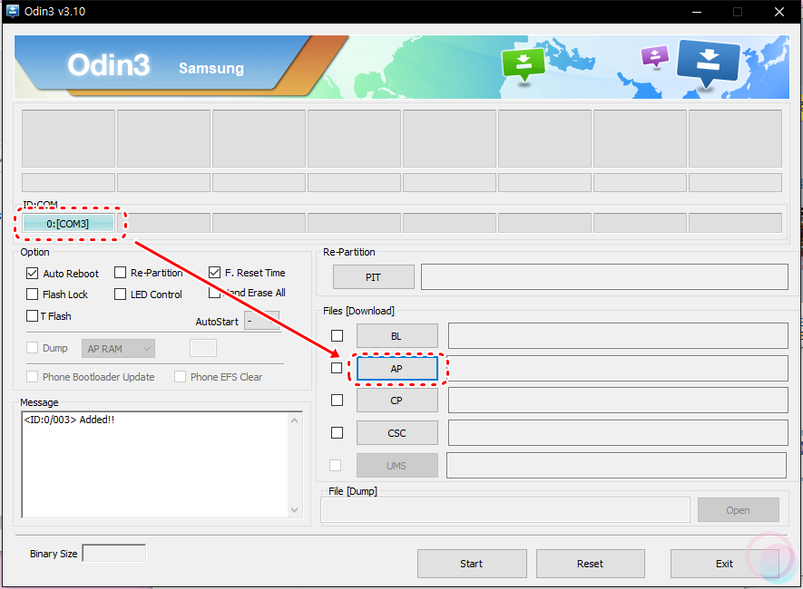 5) 오딘을 관리자 권한으로 실행하고 ID 부분에 COM3(숫자는 다를 수 있음)이라는 문자로 표기되면 갤럭시노트 10.1이 PC에 제대로 연결되었다는 것입니다. 만약 COM이 표시되지 않는다면 삼성 홈페이지에서 USB 통합 드라이버를 설치해보세요.