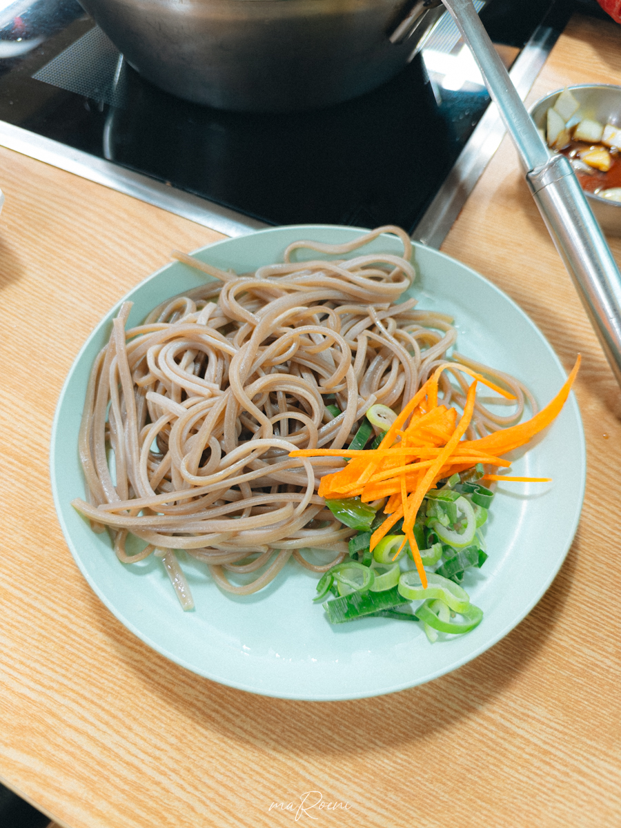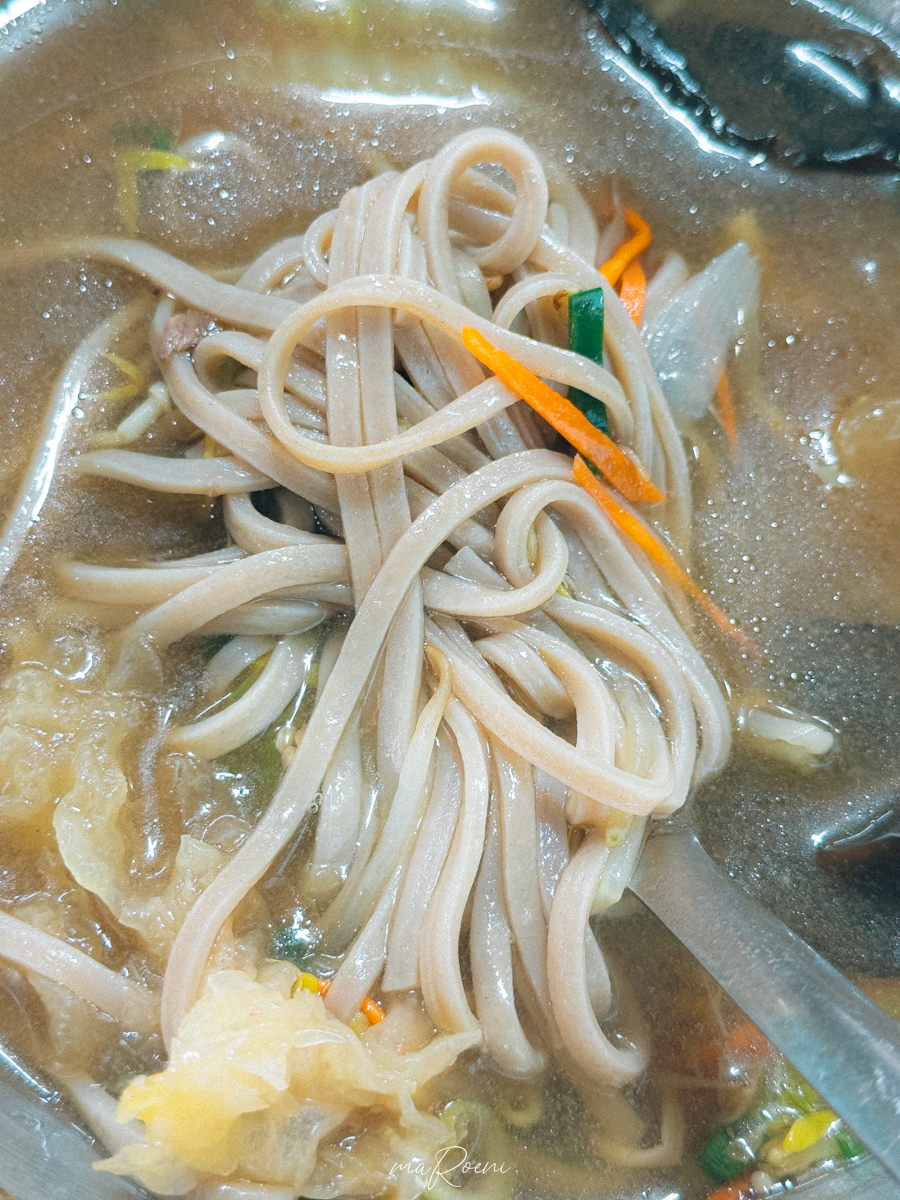 다 먹어갈 때쯤 남은 전골 국물에 넣어먹는 메밀면이 제공된다. 이런 게 있을 줄 알았다면 미리 양을 조절해서 먹는 건데.. 이미 배가 산처럼 튀어나왔을 정도로 많이 처먹은 상태라 이걸 먹고 가야 하나 말아야 하나 심각하게 고민을 했었음.