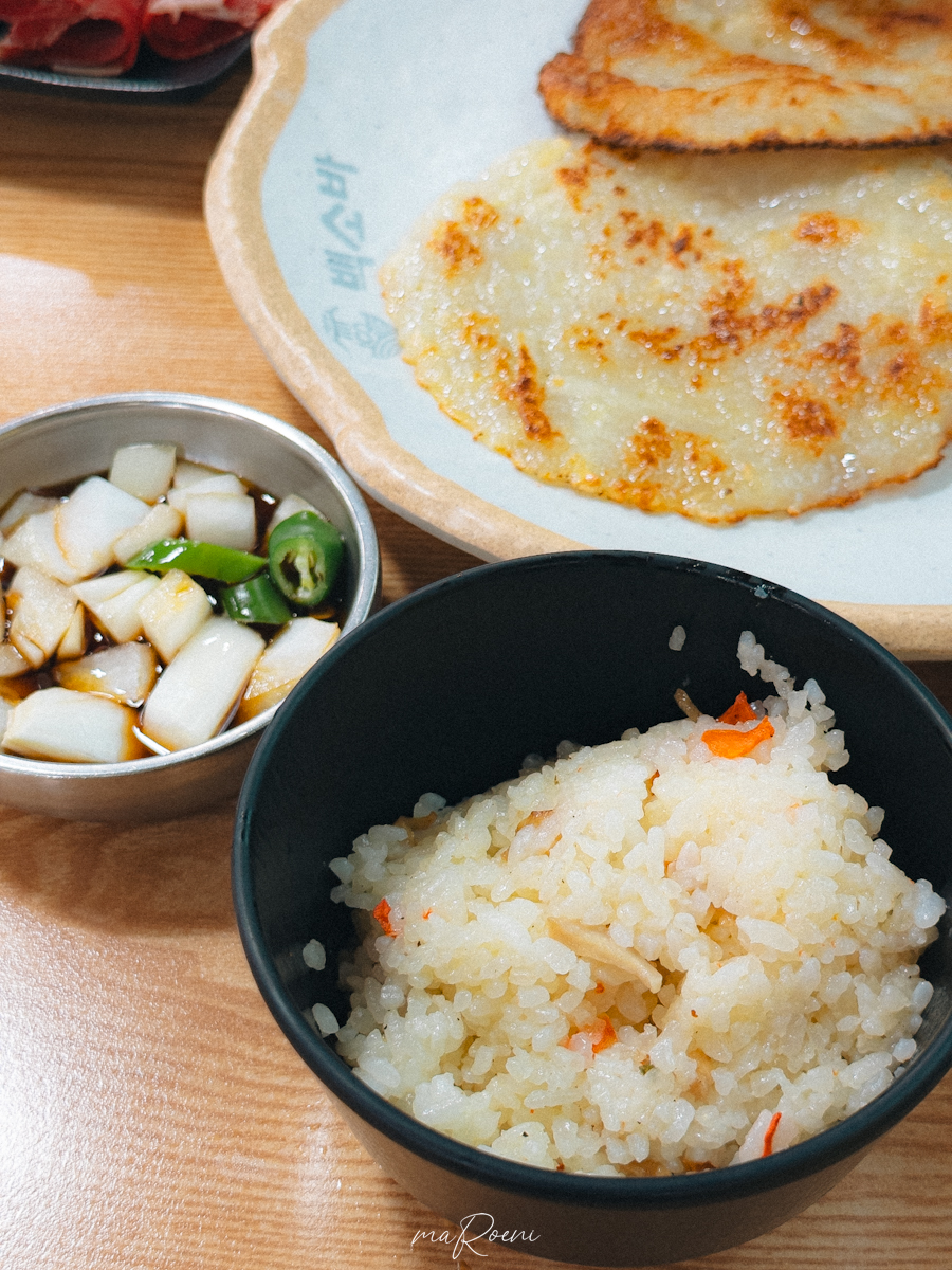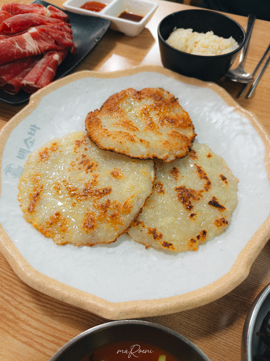 감자전이 나왔다. 감자전은 12,000원인데, 손바닥보다 작은 크기의 감자전이 3개 나온다. 한 개의 4,000원꼴이라는 건데.. 요즘 물가.. 정말 올라도 많이 올랐다. 단단한 경도와 고소한 맛을 자랑하는 감자전은 고추와 양파가 들어간 간장에 콕 찍어먹는 게 BEST다. 메인메뉴보다 더 맛있게 먹었던 게 바로 이 감자전이었음.