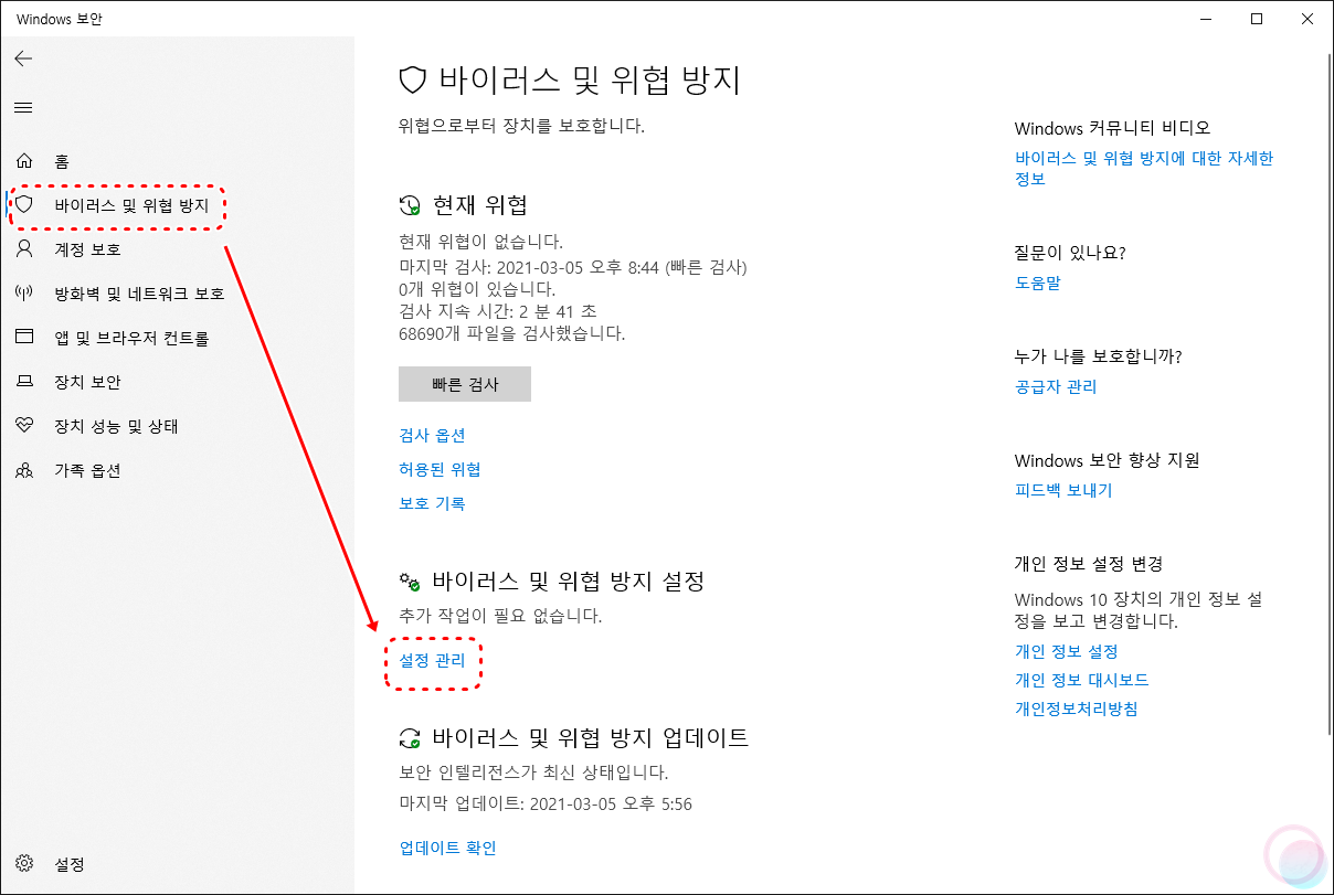 왼쪽 메뉴에서 바이러스 및 위협 방지를 누른 후 설정 관리에 들어가서 실시간 보호 기능을 종료해주시면 됩니다.