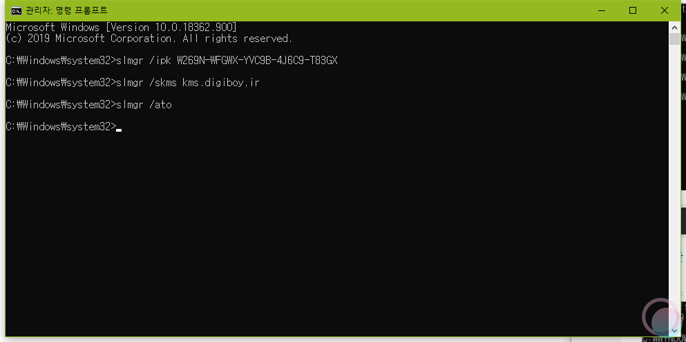 slmgr /ato를 입력하시면 윈도우10 정품인증을 받습니다. 참고로 마지막 명령어를 입력하게 되면 20~30초 정도 딜레이가 발생하니 참고하시길 바랍니다.