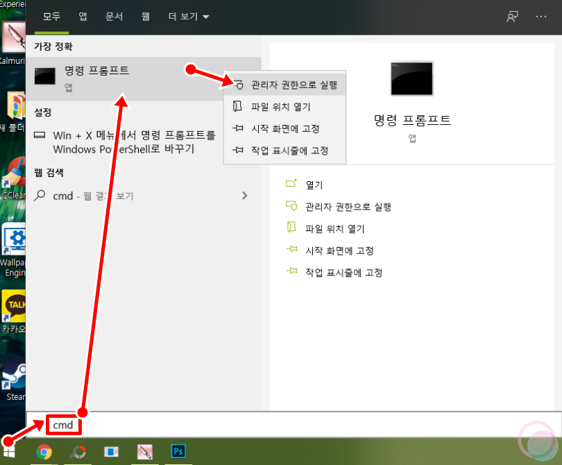 시작을 누르고 CMD를 검색한 후 관리자 권한으로 실행하기를 눌러주세요.