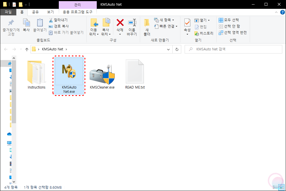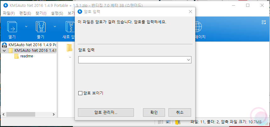 본문에 첨부된 KMSAuto Net을 다운받아준 후 압축을 해제해줍니다. 압축 암호가 걸려있을텐데 암호는 windows입니다.