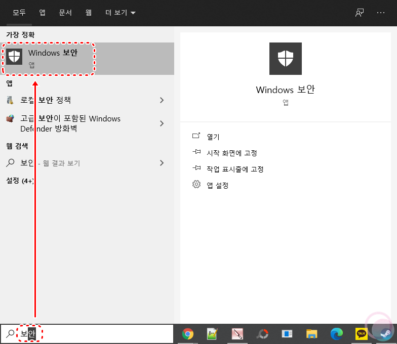 KMSAuto Net을 설치하기에 앞서, 백신 프로그램이 소프트웨어를 자동으로 삭제하지 않게끔 실시간 보호 기능을 미리 비활성화 해두어야 합니다. 시작-보안을 검색하셔서 Windows 보안을 실행해주세요.