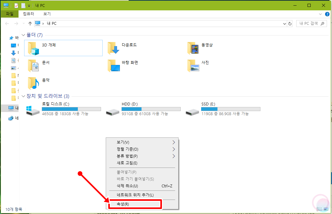 위의 방법 말고도 CMD를 통해 윈도우10 정품인증을 받을 수 있는 방법이 있습니다. 먼저 자신의 PC에 설치된 윈도우 버전을 확인해주세요. 확인 방법은 내PC에 들어간 다음 빈공간에서 마우스 오른쪽 클릭을 하여 속성을 눌러주시면 됩니다.