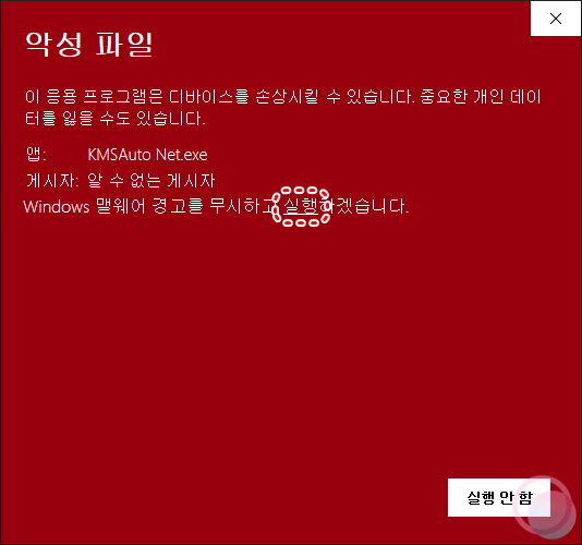 압축을 해제한 폴더 안에 있는 KMSAuto Net.exe을 실행하면 악성 파일이라는 안내메시지가 출력되는데, 추가정보를 누른 후 실행을 눌러주시면 정상적으로 실행됩니다.