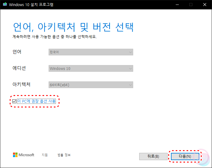 언어, 아키텍처 및 버전 선택 화면에서 원하는 것이 있다면 수동으로 설정해주시고 PC에 최적화된 에디션을 원할 경우에는 이 PC에 권장 옵션 사용에 체크한 후 다음으로 넘어가줍니다. 다음 화면에서 USB 플래시 드라이브로 체크한 후 다음을 눌러주세요.