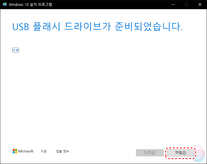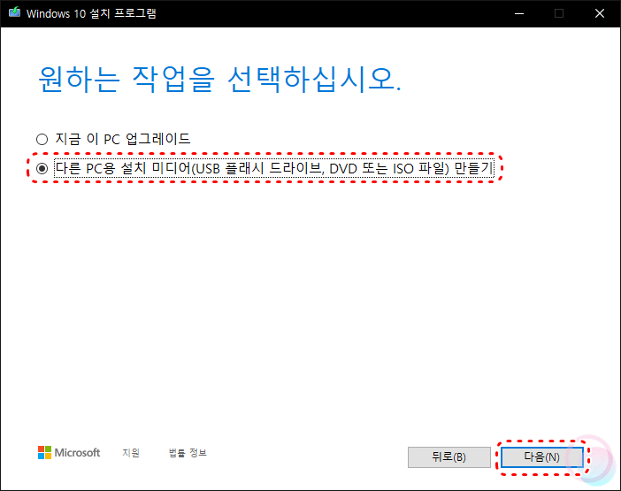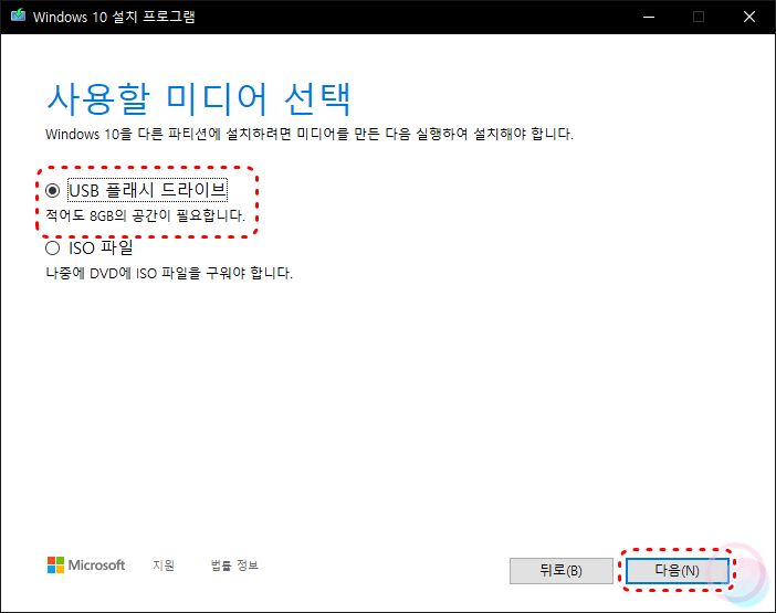 PC에 USB를 연결하고 연결된 USB를 선택한 후 다음을 눌러주시면 USB에 윈도우10 설치 파일이 플래싱됩니다.
