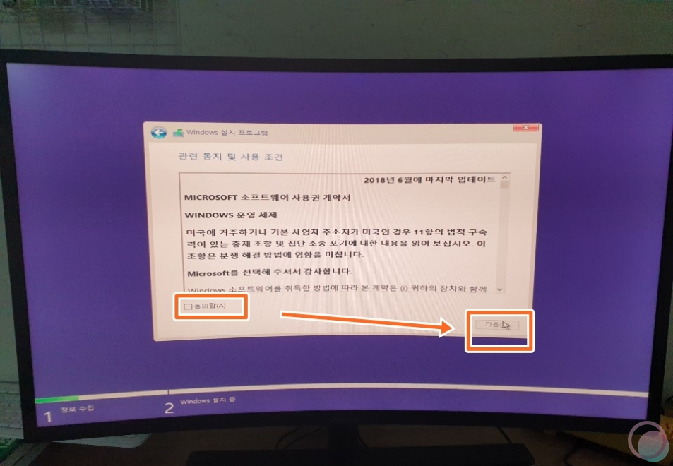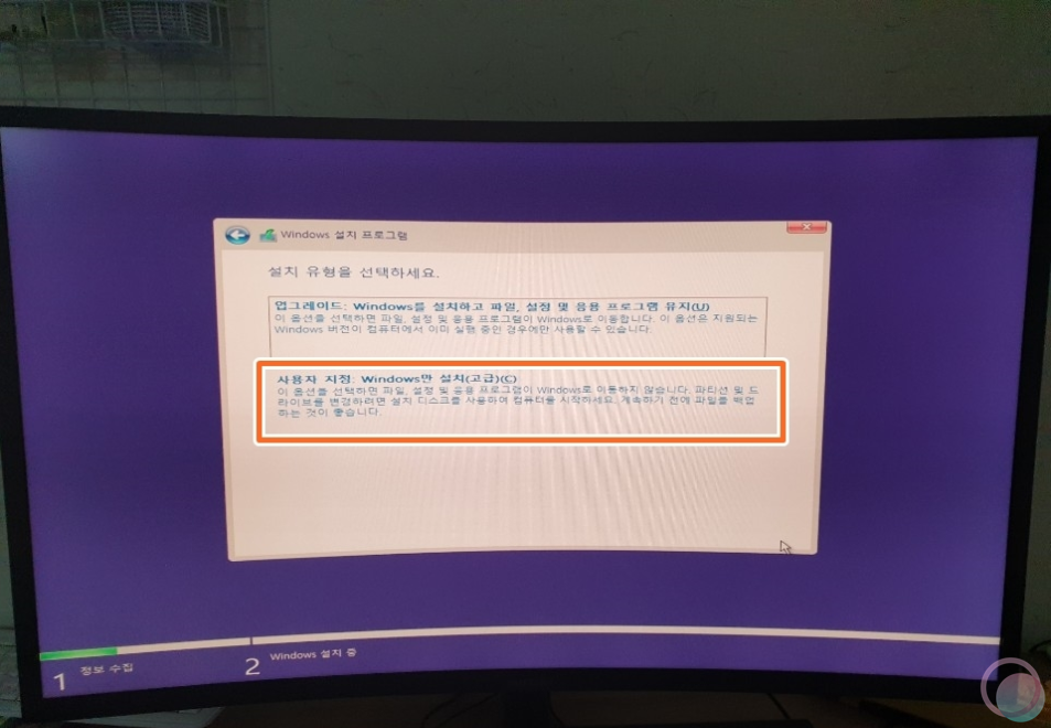 약관에 동의한 후 포맷을 진행하기 위해 사용자 지정: Windows만 설치(고급)을 선택해줍니다.