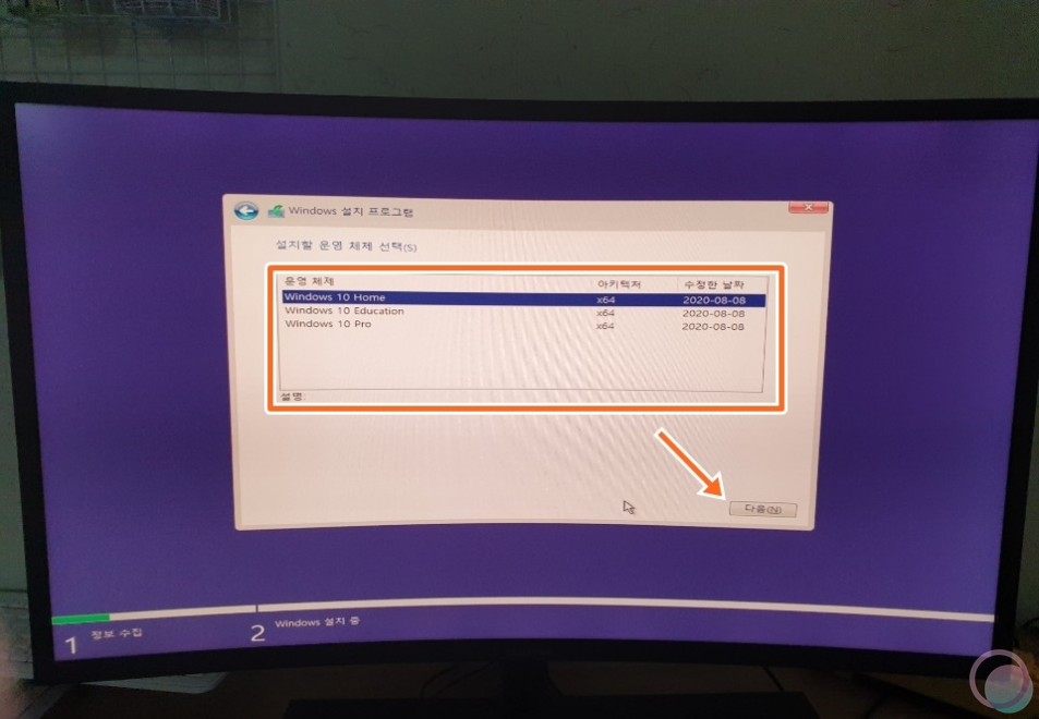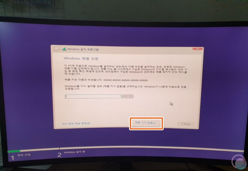 윈도우10 제품키를 입력하는 화면이 나오면 나중에 정품인증을 받아도 되니, 우선은 제품 키가 없음을 선택해주시고 다음 화면에서 윈도우 설치 버전을 선택해줍니다.