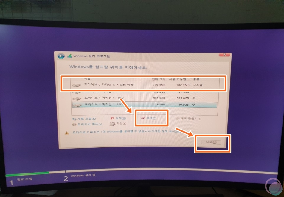 이 화면에서 PC에서 사용 중인 모든 드라이브가 보여질텐데, 윈도우가 설치된 드라이브는 종류 영역에 시스템이라고 표기가 되어있을 것입니다. 시스템이 설치된 모든 드라이브를 선택한 후 하단의 포맷을 눌러주세요.(포맷을 진행하시면 모든 데이터가 삭제됩니다.) 포맷이 완료된 후 윈도우10을 설치할 드라이브를 선택하고 다음을 눌러주시면 윈도우10 클린 설치가 진행될 것입니다.